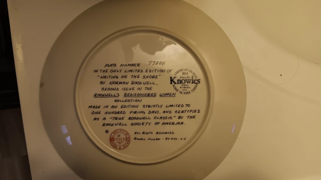Selling a Norman Rockwell collector's plate from the Rockwell's Rediscovered Women Collection. It's the "Waiting on the Shore" plate, second issue. Plate number is 77006. Made in an edition strictly limited to one hundred firing days and certified as a "true Rockwell Classic" by the Rockwell Society of America