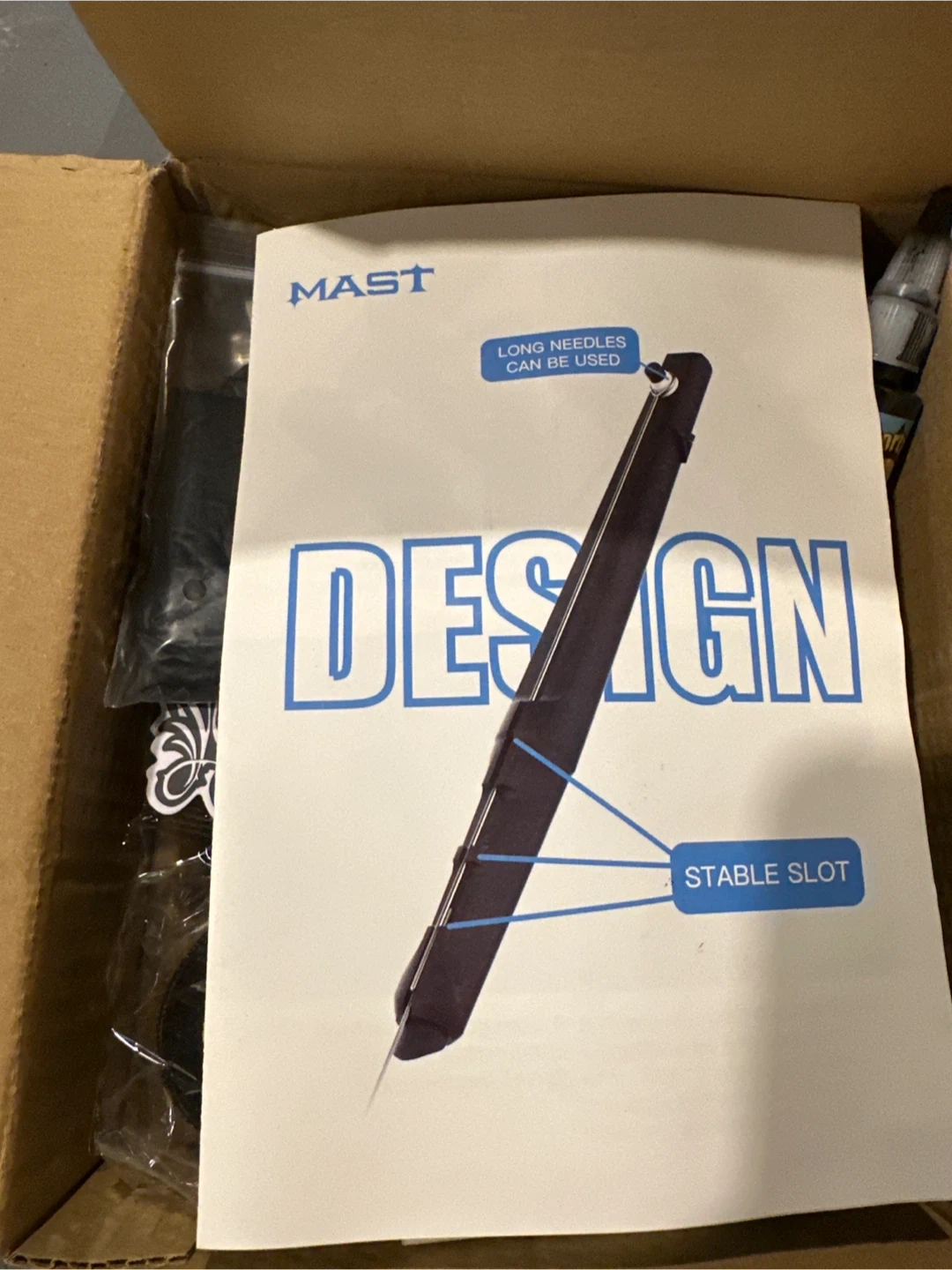 Selling a MAST Design tattoo pen kit. The kit includes long needles that can be used with a stable slot design. It also comes with various accessories, including ink and other supplies, all neatly packed in the original box
