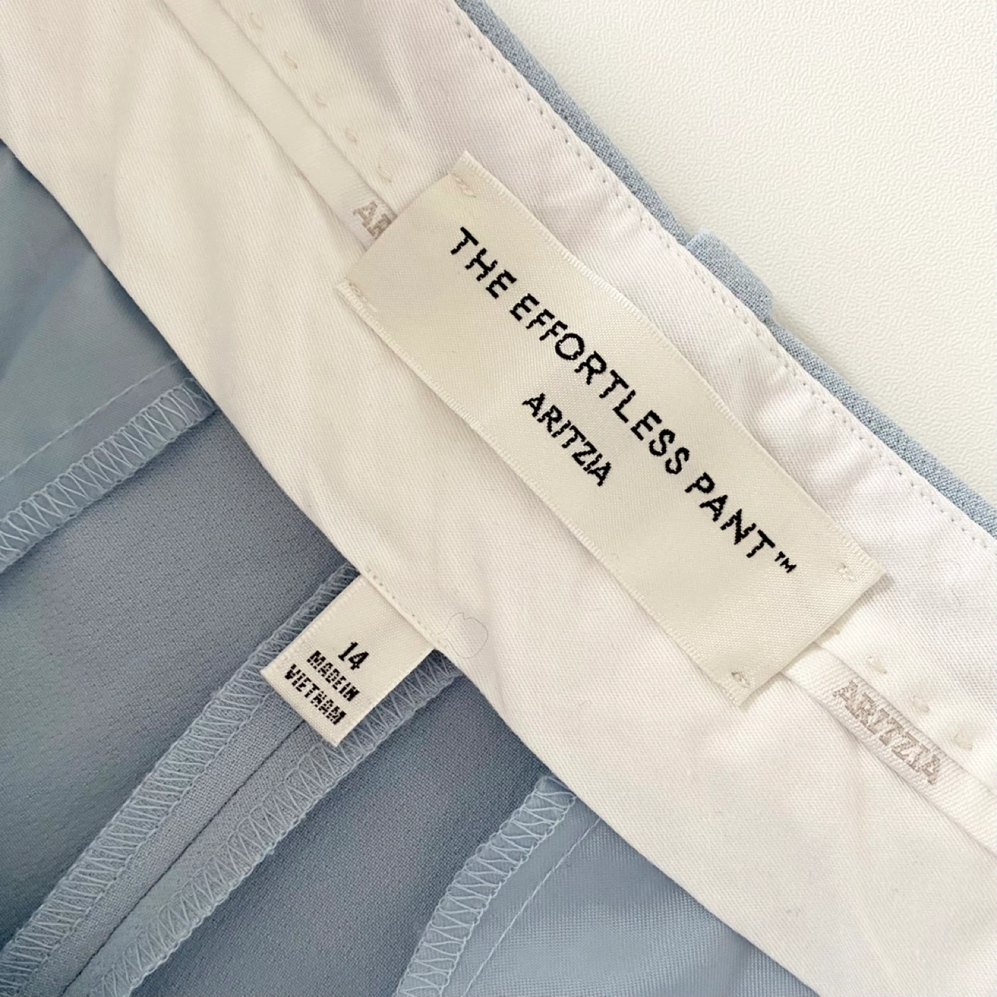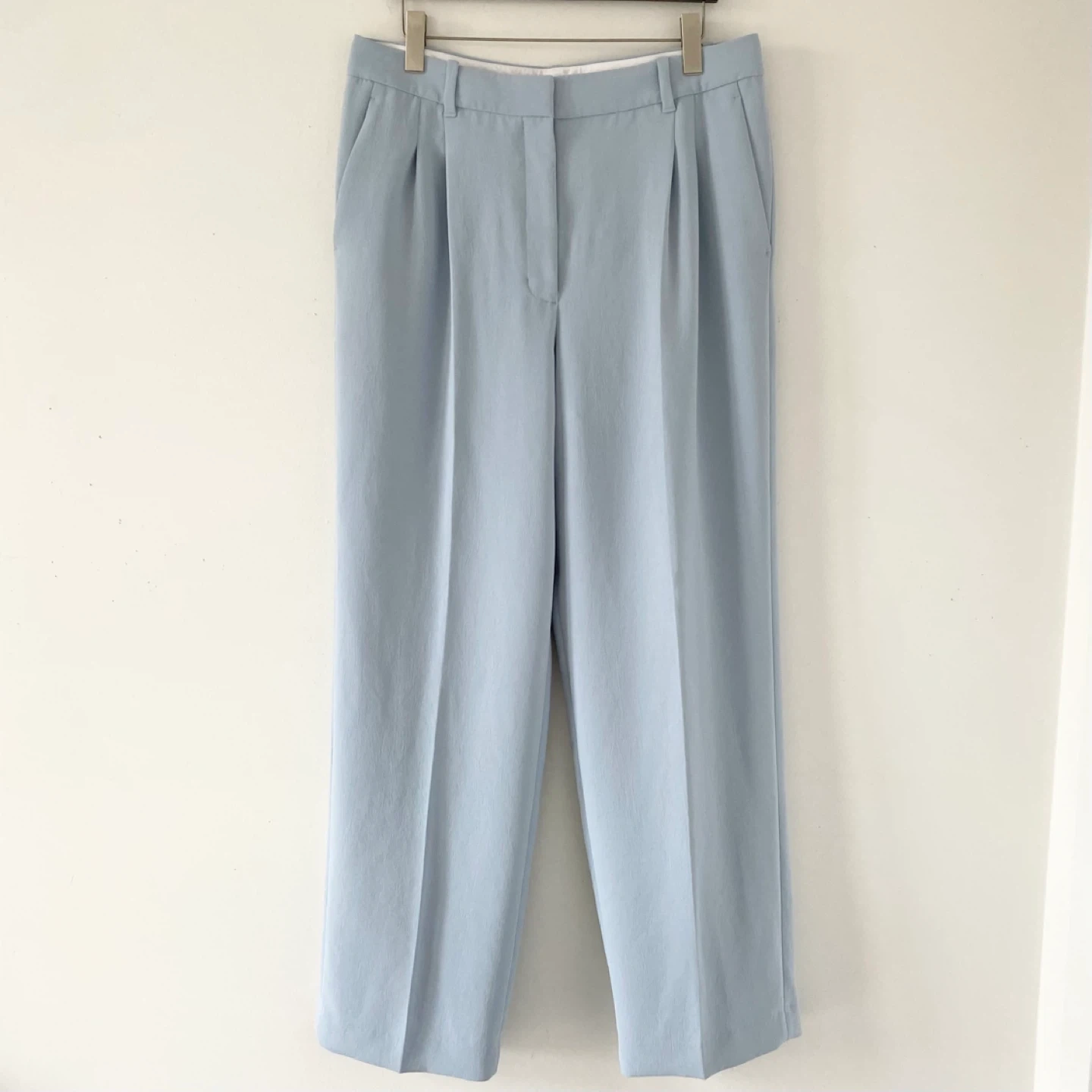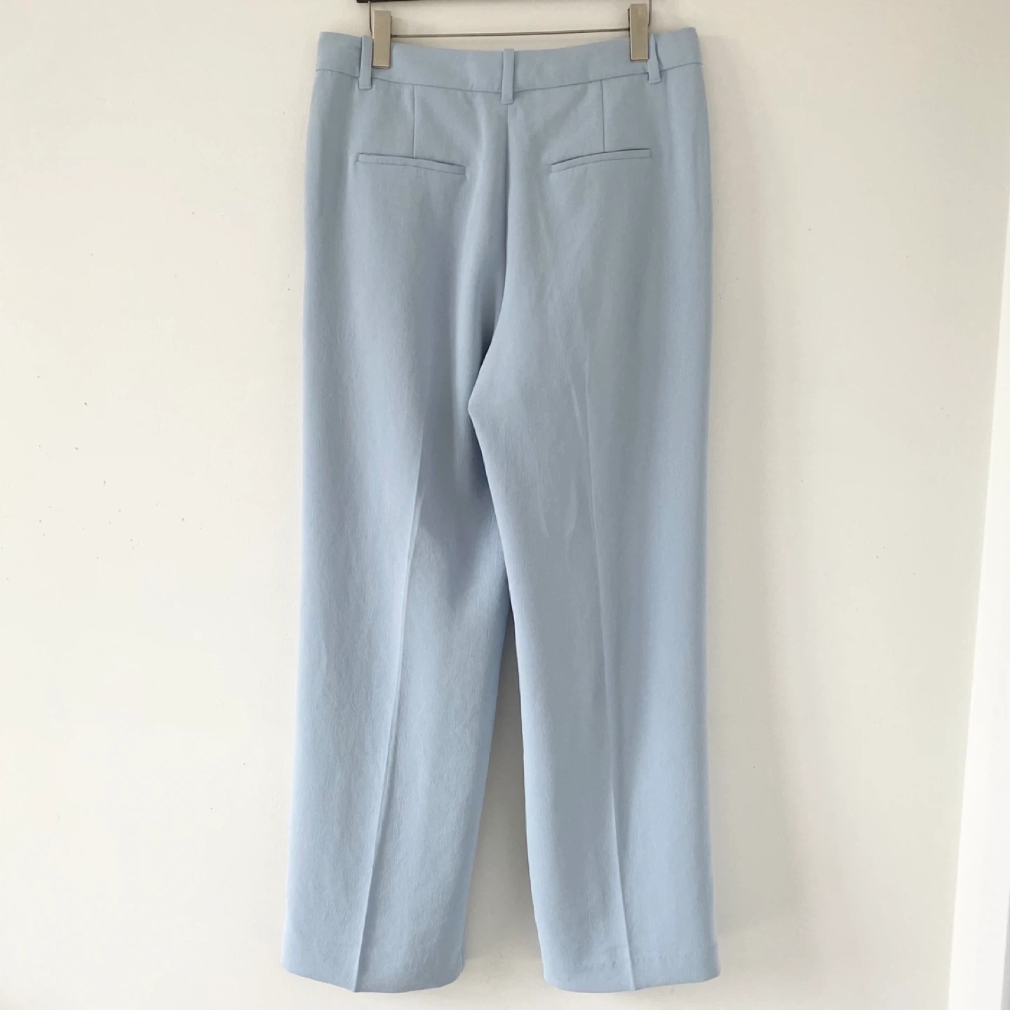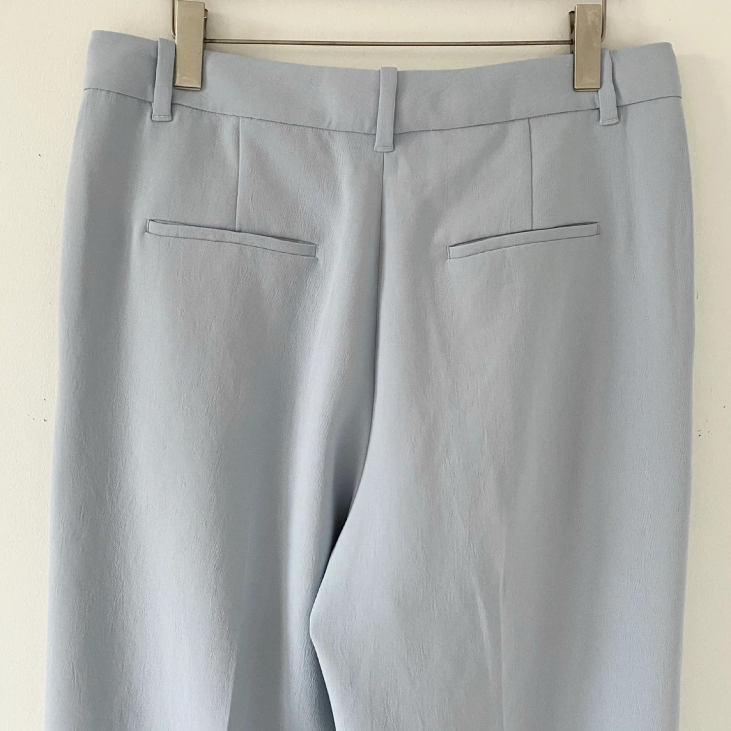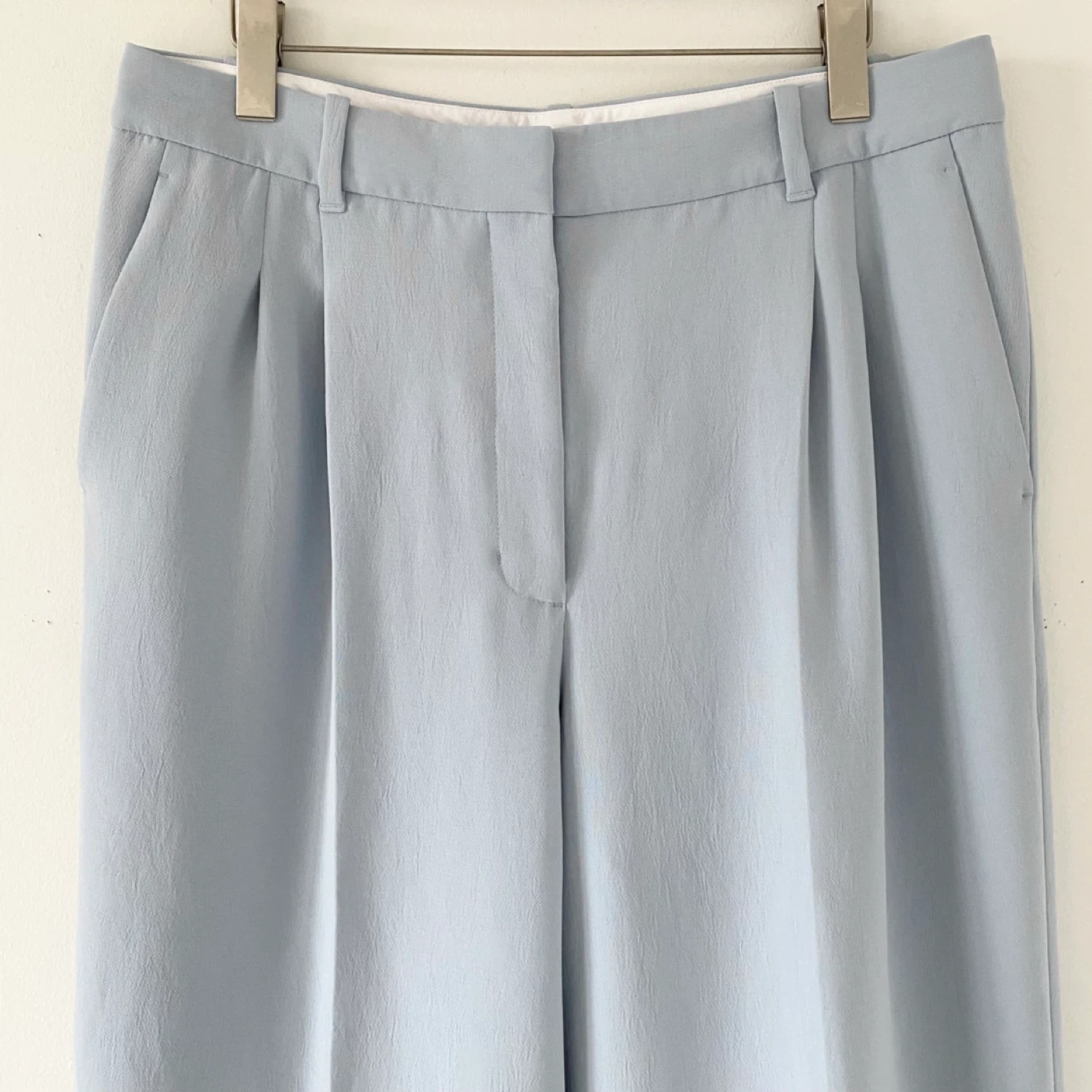 Aritzia Wilfred Effortless pants. Features a high-rise, front pleats and side pockets. It's made of crepette - Japanese crepe fabric in a light blue colour. It has a subtle texture, doesn't wrinkle easily and drapes like a dream! It's also not too light or heavy - a perfect weight to be worn all year around. Back pockets are still sewn shut. There are tiny snags at the back waistband as per the last pic. Otherwise they are clean and in excellent condition.