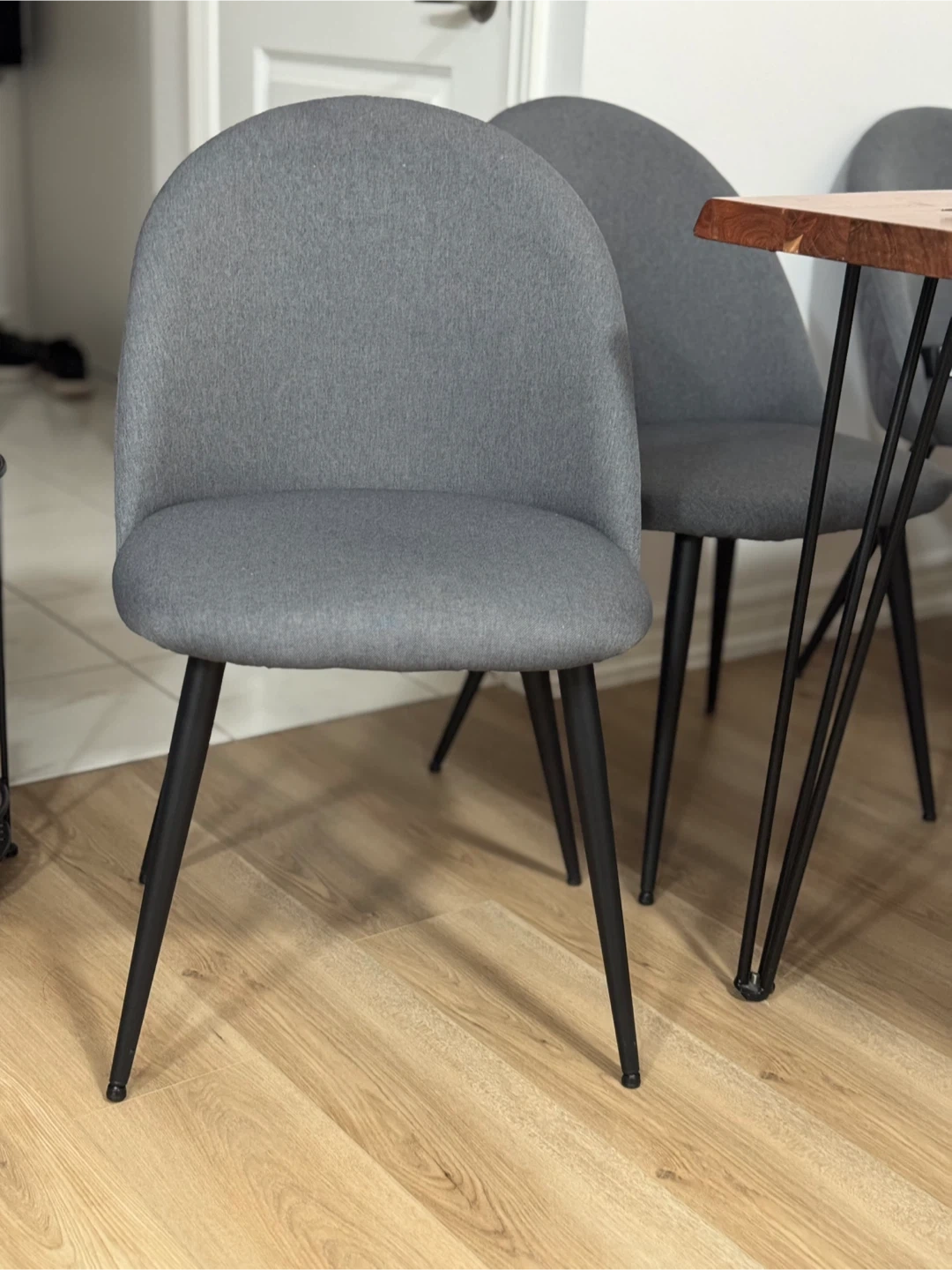 Selling a set of 4 stylish dining chairs! Each $50 They feature a modern design with a quilted back and sleek black legs. The chairs are grey and would look great in any dining room or kitchen space