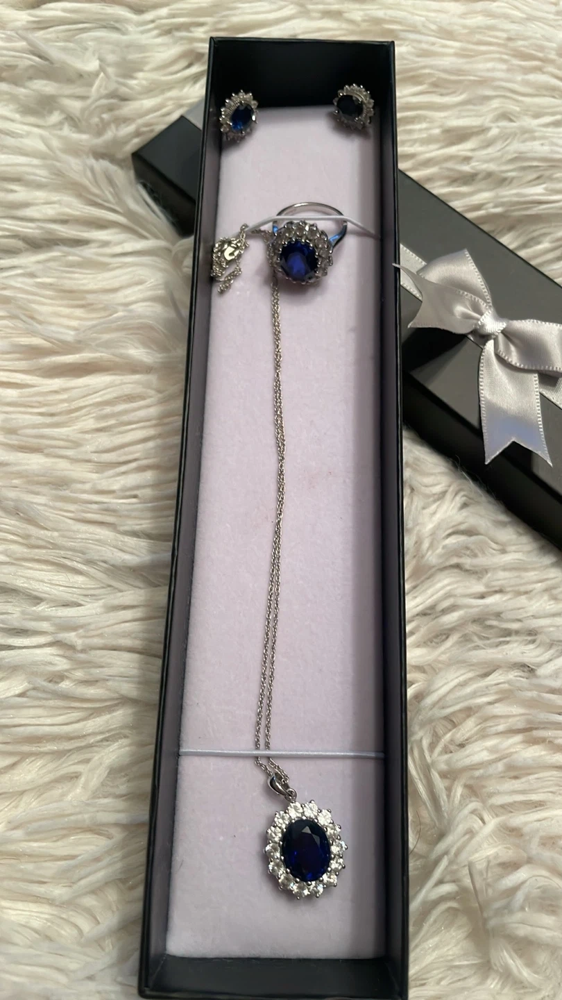 Selling a beautiful sterling silver stamped jewellery set that includes a necklace, a ring, and a pair of earrings. The set features lab created sapphires and cz. It comes in gift box, making it perfect for gifting or keeping it safe!