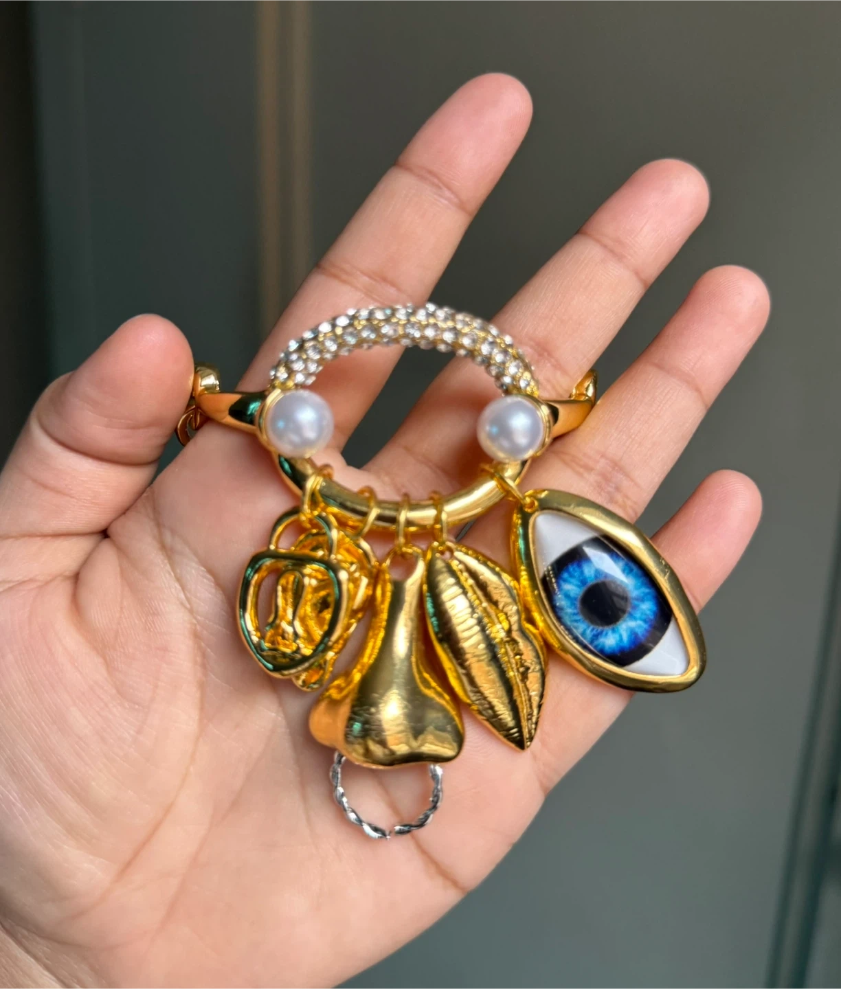 Elegant gold facial features charm bracelet with featuring a striking blue eye pendant. Perfect for adding a touch of sophistication to any outfit.