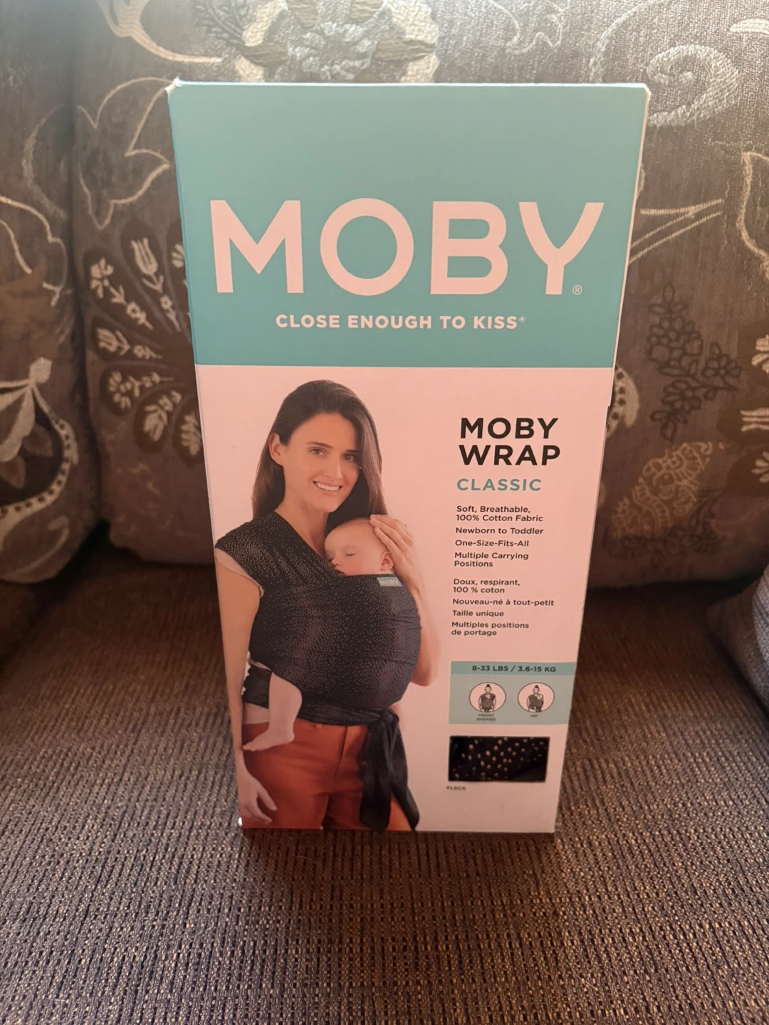 Selling a Moby Wrap Classic in the Fleck design! It's soft, breathable, and made of 100% cotton fabric. Perfect for newborns to toddlers. It's one-size-fits-all and allows for multiple carrying positions. The weight range is 8-33 lbs / 3.6-15 kg