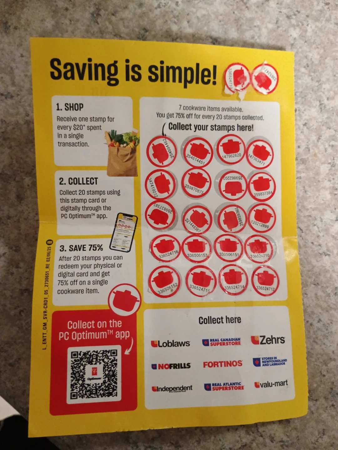 Here are some stamps to help you save on cookware. The stamps are from PC Optimum. You'll be on your way to cooking up a delicious meal in no time, feeling relaxed and content.This is a promotion for Kuhn Rikon cookware. Collect stamps and get 75% off one piece of high quality Swiss Design Cookware! You get one stamp for every $20 spent.