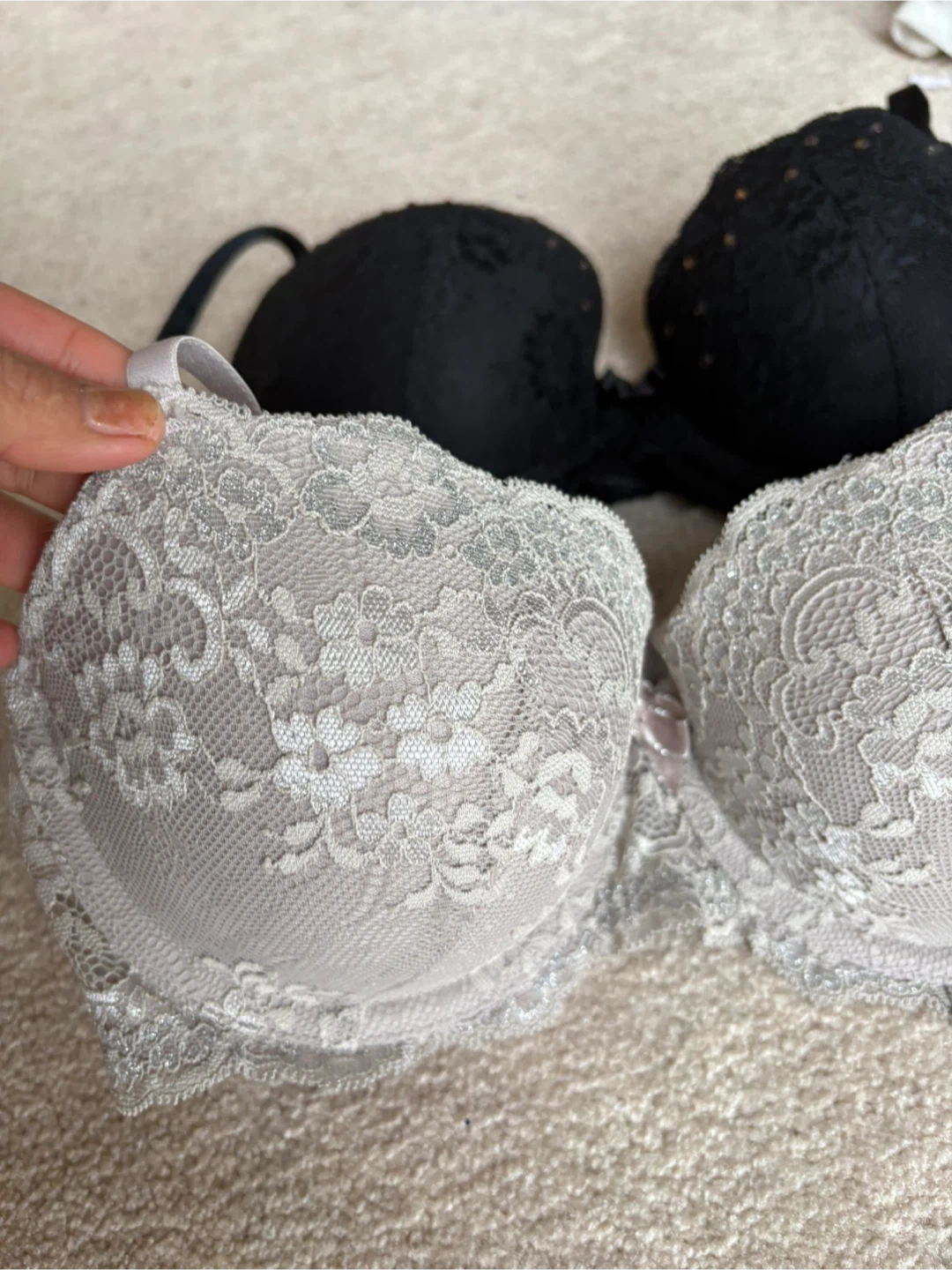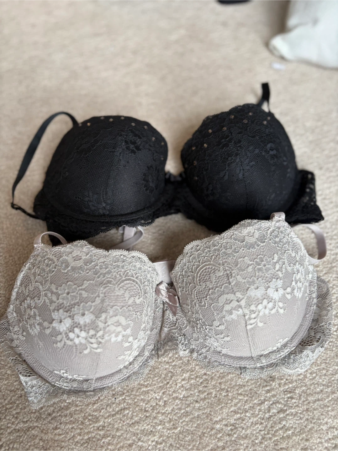 Two bras for sale! One is a light grey/white lace and the other is black. Both are size 34B and from Penningtons.