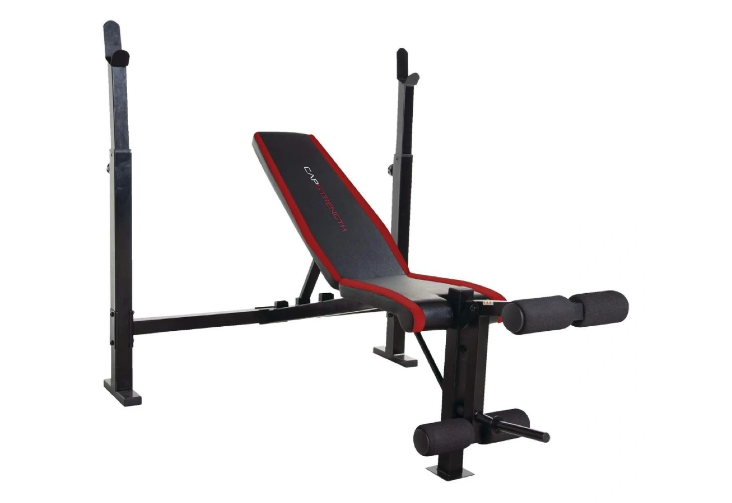 The Cap Barbell Adjustable Olympic Weight Bench includes a leg extension, adjustable uprights, and a five-position back pad
