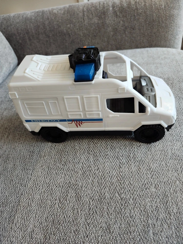 Toy emergency vehicle! It's white with blue and red accents and has an "EMERGENCY" label on the side. About 10 inches in length.