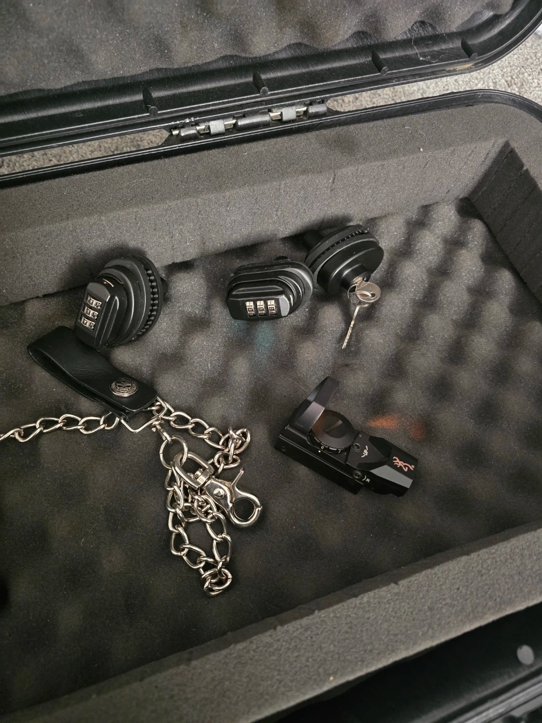 Selling a Harley Davidson black leather wallet with a chain. It's in great condition and has a classic look! Along with a red dot site and three trigger locks with a gun case
