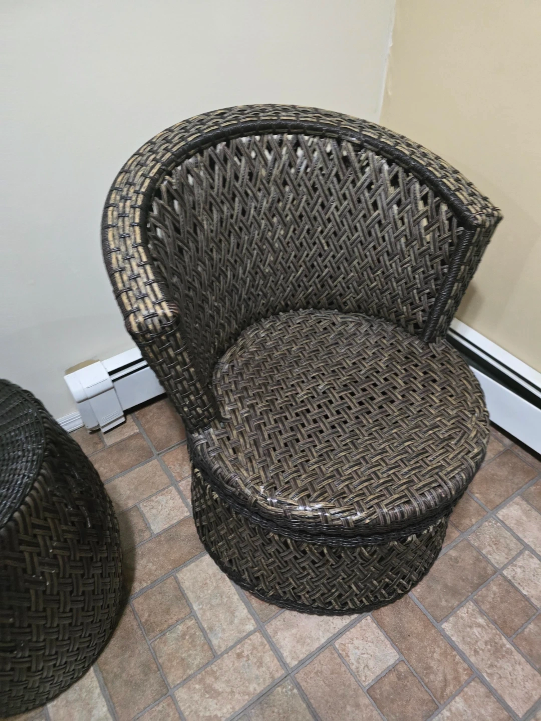 Selling a cute wicker chair and ottoman set! The set is in great condition and would look great in any room. The color is a dark brown/gray. Perfect for a sunroom or living room!