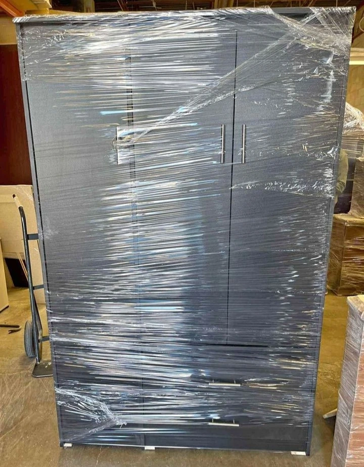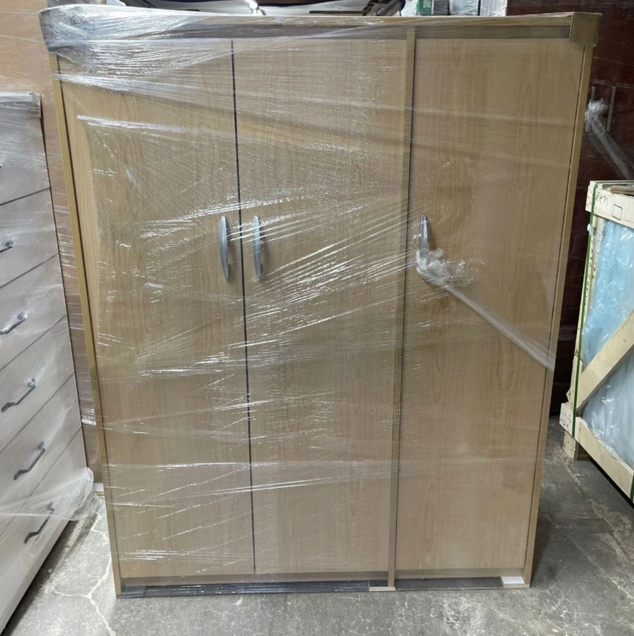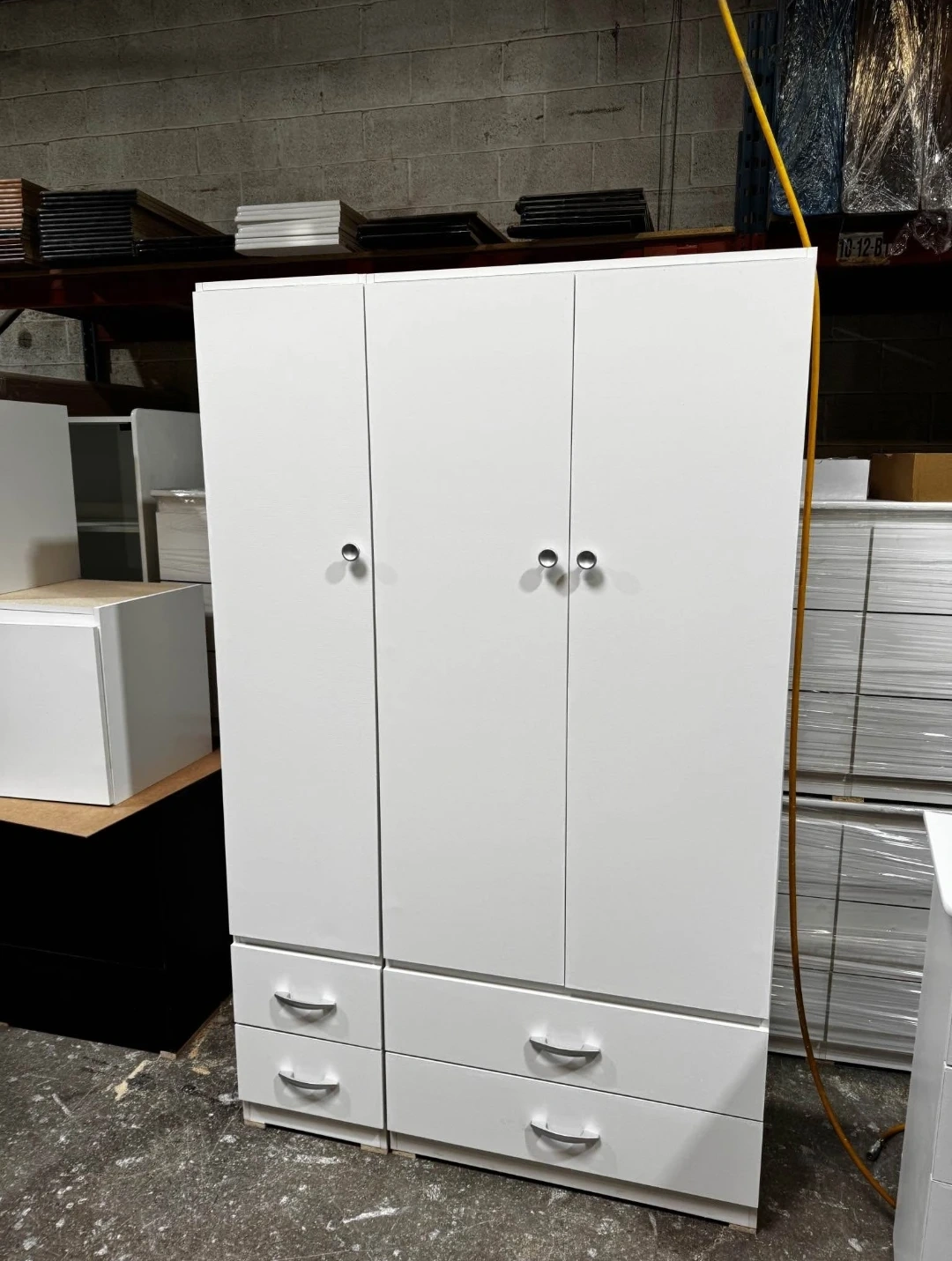 Selling a wardrobe with drawers. It's brand new and would be perfect for extra storage in a bedroom or closet. The wardrobe is white and features three doors and two drawers at the bottom. It's a great piece to keep your clothes organized!