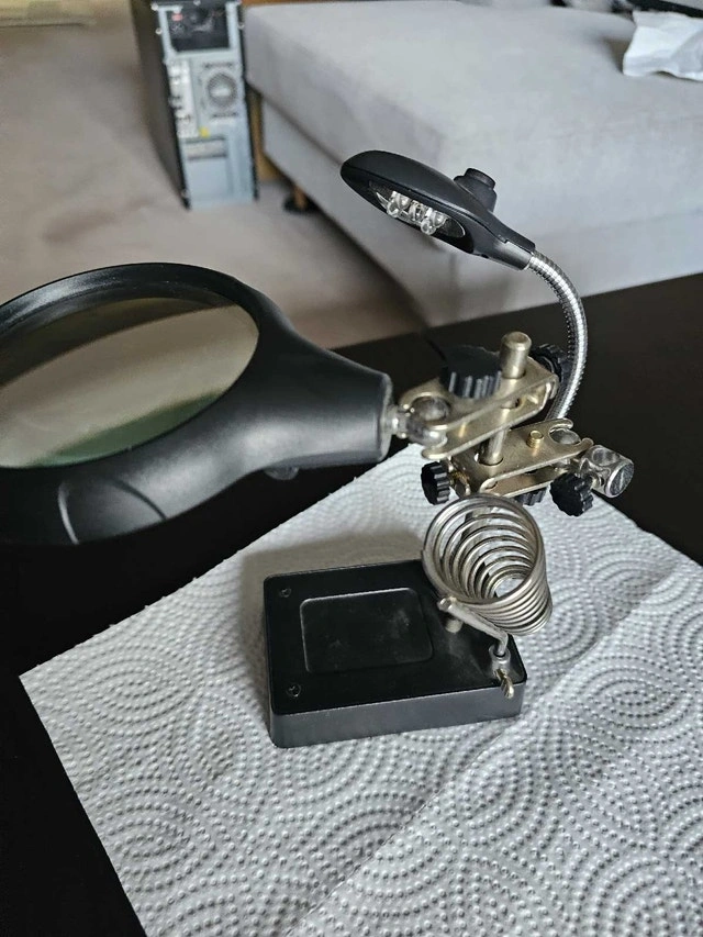 This helping hand magnifier is perfect for detailed work. It features a magnifying glass, LED light, and adjustable arms to hold your projects in place. I have found it incredibly useful for soldering, electronics repair, and crafting. Being sold in used condition. It's been so helpful, I almost feel like I'm cheating when I use it. If the ad is up, it's available!