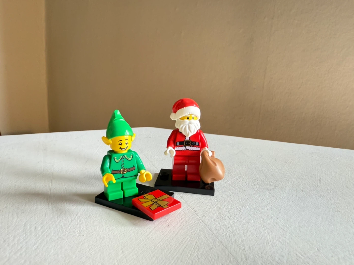Adorable Lego Santa figure 🧑🎄 with his gift sac, alongside one of his elves with a present 🎁