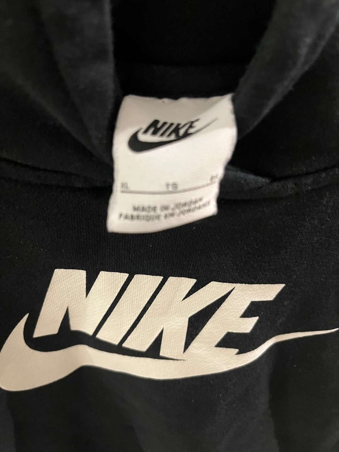 Selling a Nike cropped hoodie in black. It's in great condition and features the iconic Nike logo on the back. Size is XL for girls?