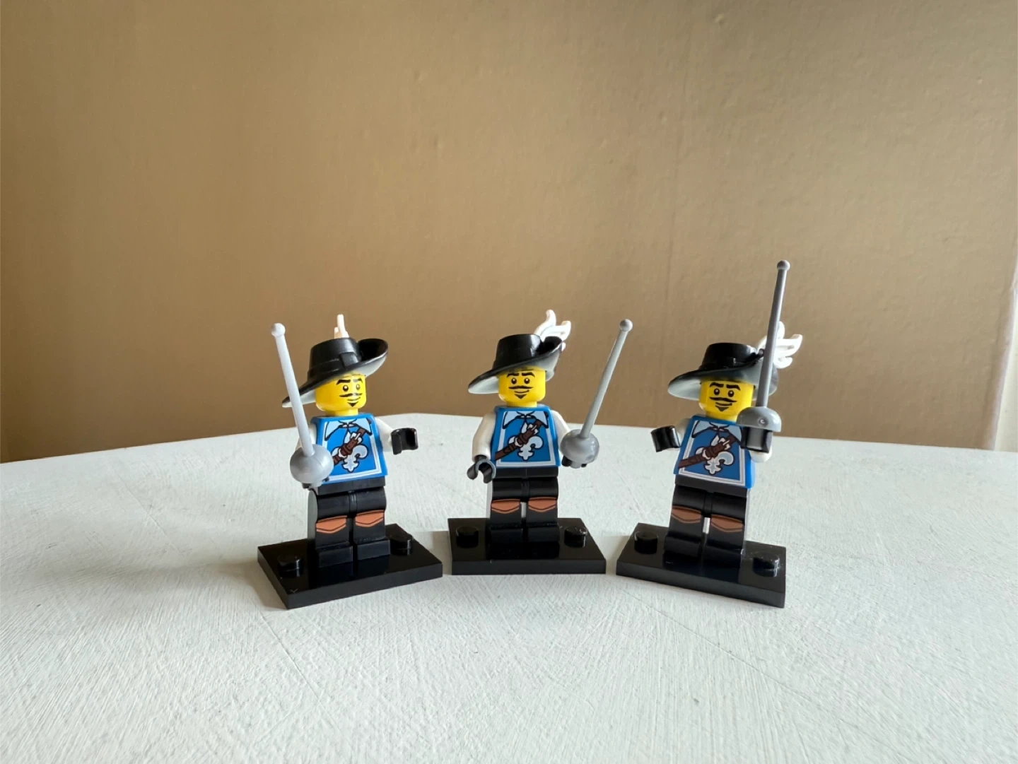Adorable 3 Musketeers set of Lego figures, each with a feathered hat and a rapier sword. Each comes with its own flat black stand.