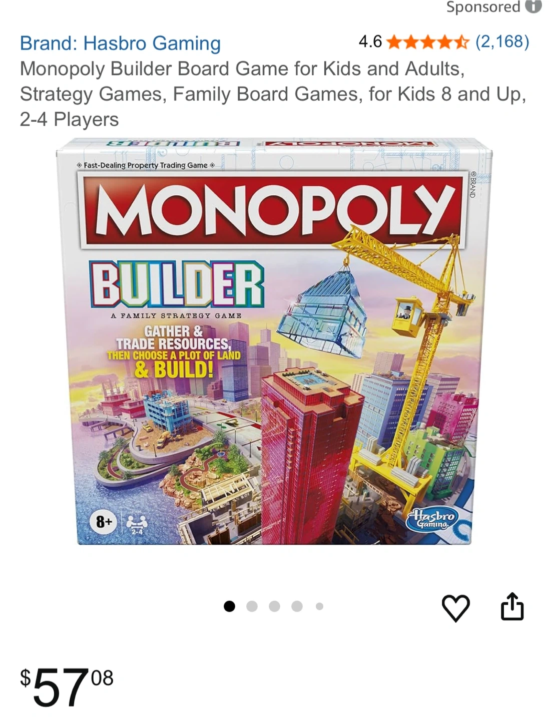 Pick up in Utopia. Selling a used Monopoly Builder board game! It's a family strategy game where you gather and trade resources, then choose a plot of land and build! Recommended for ages 8+