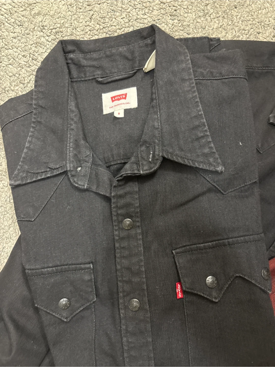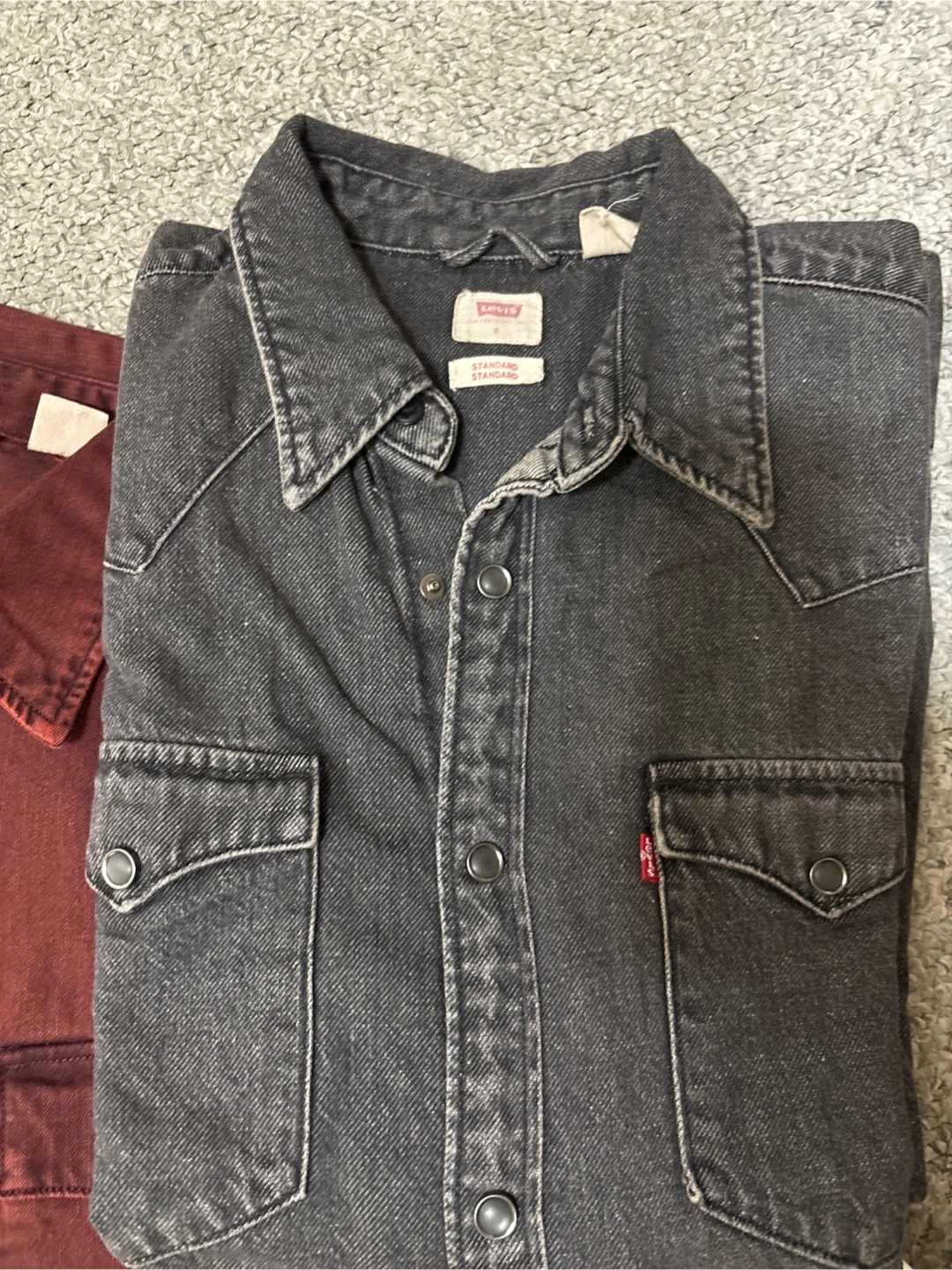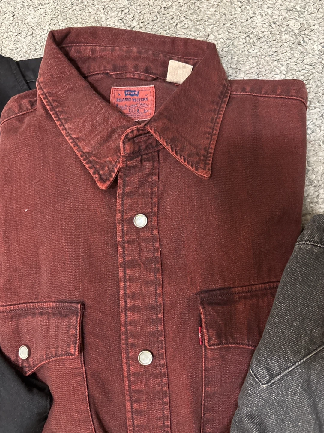 Selling a few denim shirts in great condition! There's a black and a red Levi's shirt, both size S. Also included is a white GUESS denim shirt, size S as well. All are in good shape and ready for a new home!