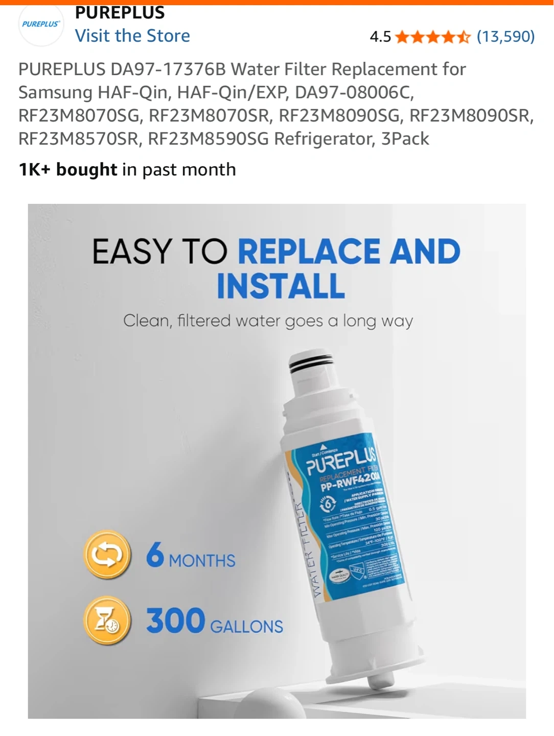 Selling a PUREPLUS DA97-17376B water filter, perfect for your Samsung refrigerator! It's easy to replace and install, ensuring clean, filtered water for your family. This filter is designed to last for 6 months or 300 gallons. Keep your water fresh and your fridge running smoothly!