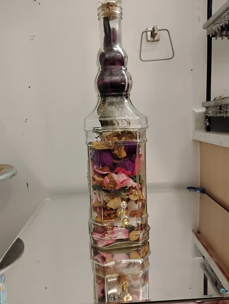 Selling a unique decorative glass bottle filled with dried flowers. It's a beautiful piece that adds a touch of elegance to any room. Perfect for adding a bit of charm to your home decor!