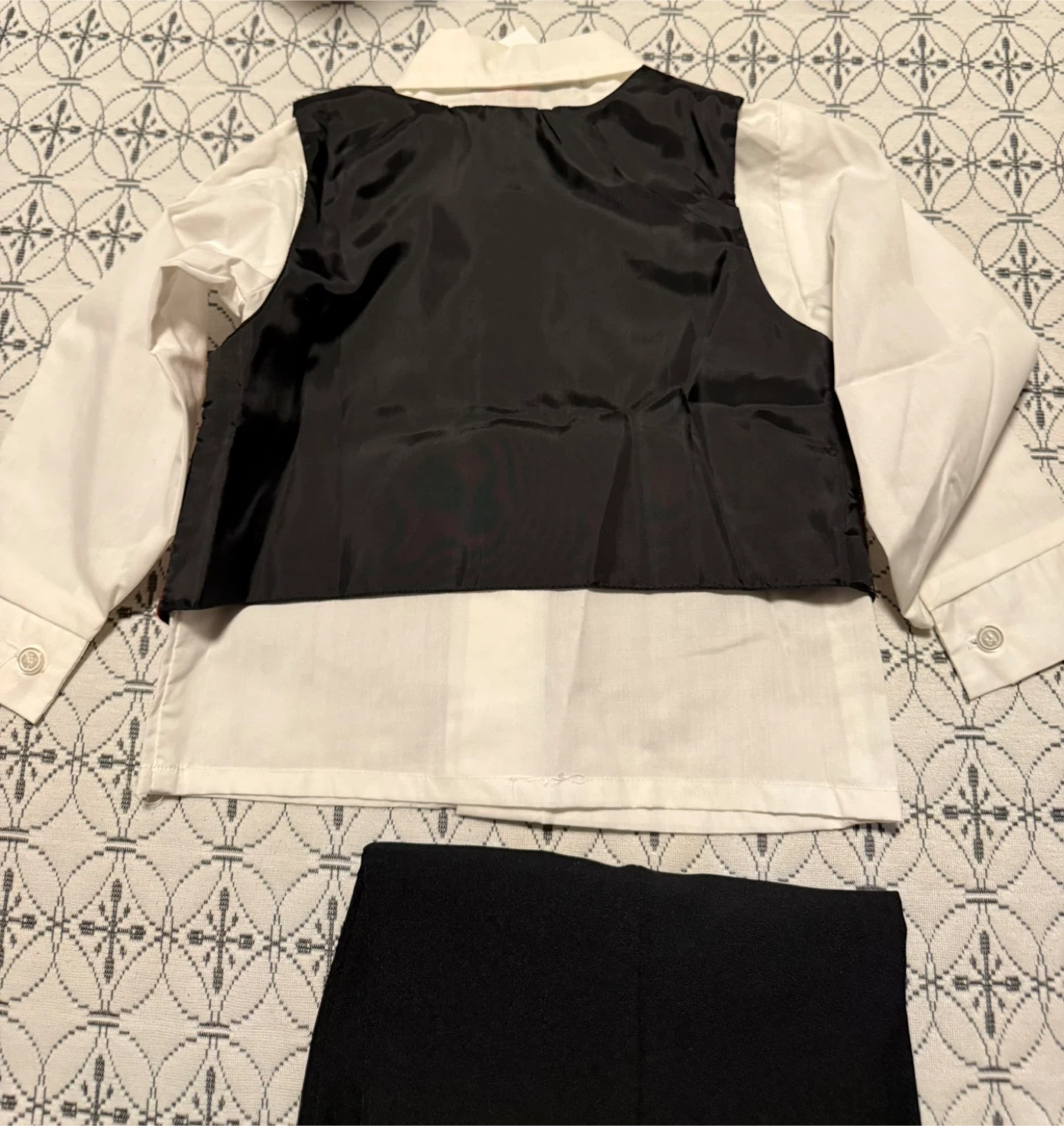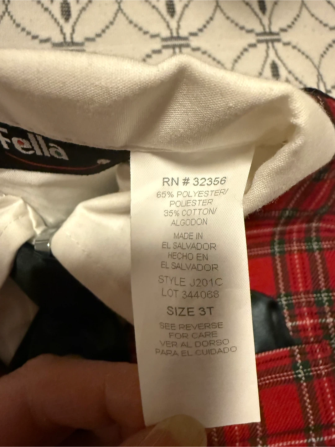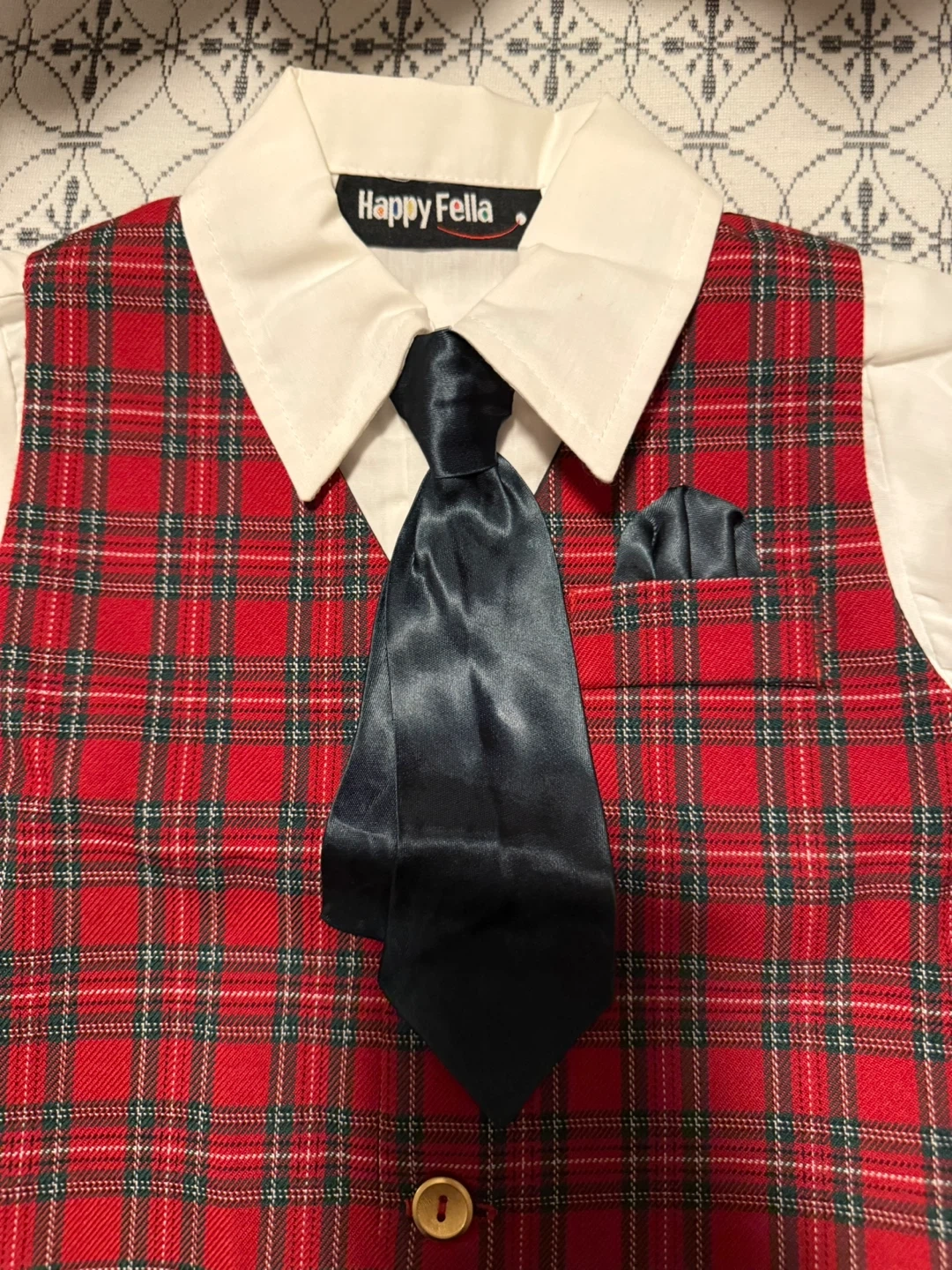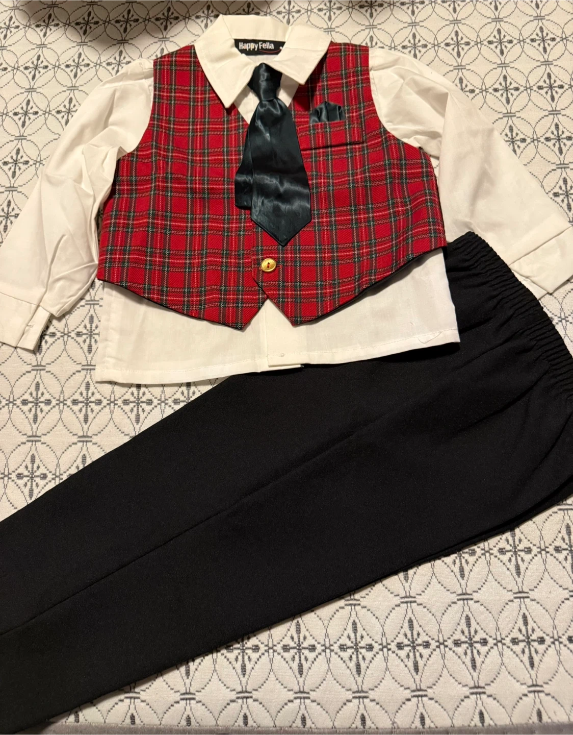 A complete and adorable four-piece suit for boys, size 3T! This set from Happy Fella includes a white collared shirt, a festive red plaid vest, a black tie, and black pants. Never worn.
