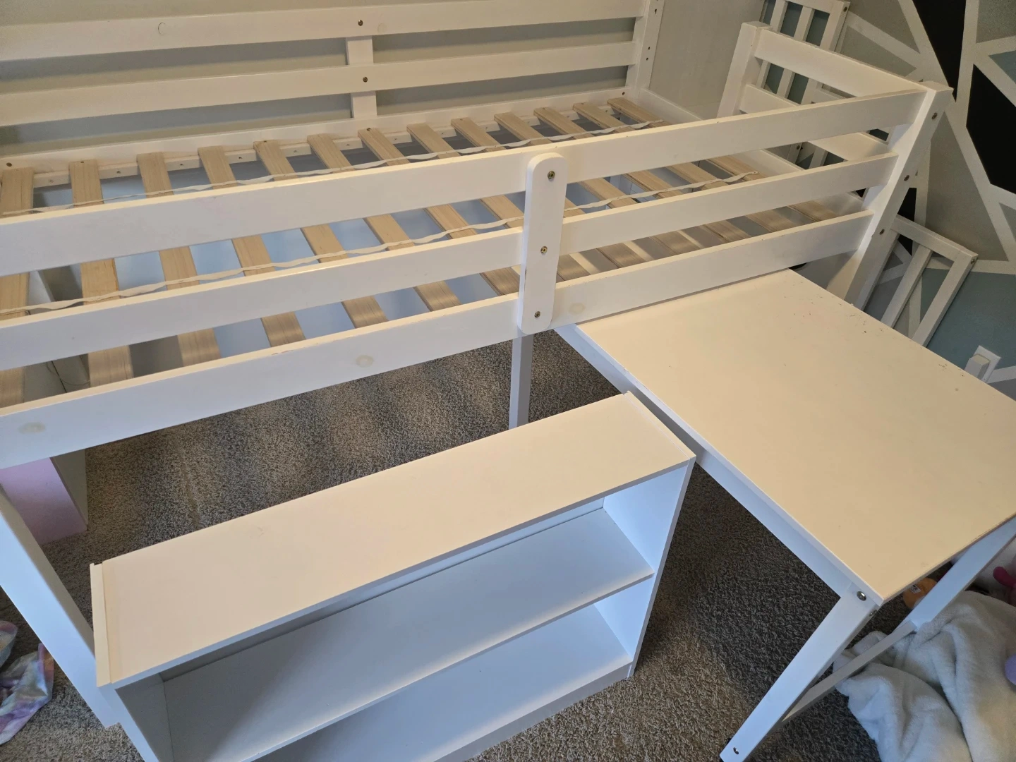 Selling a white loft bed that includes a under bed desk and shelving unit. It's a great space-saving solution for a kid's or teen's room. The bed is in good condition with some marks and scratches, mostly on the desk.