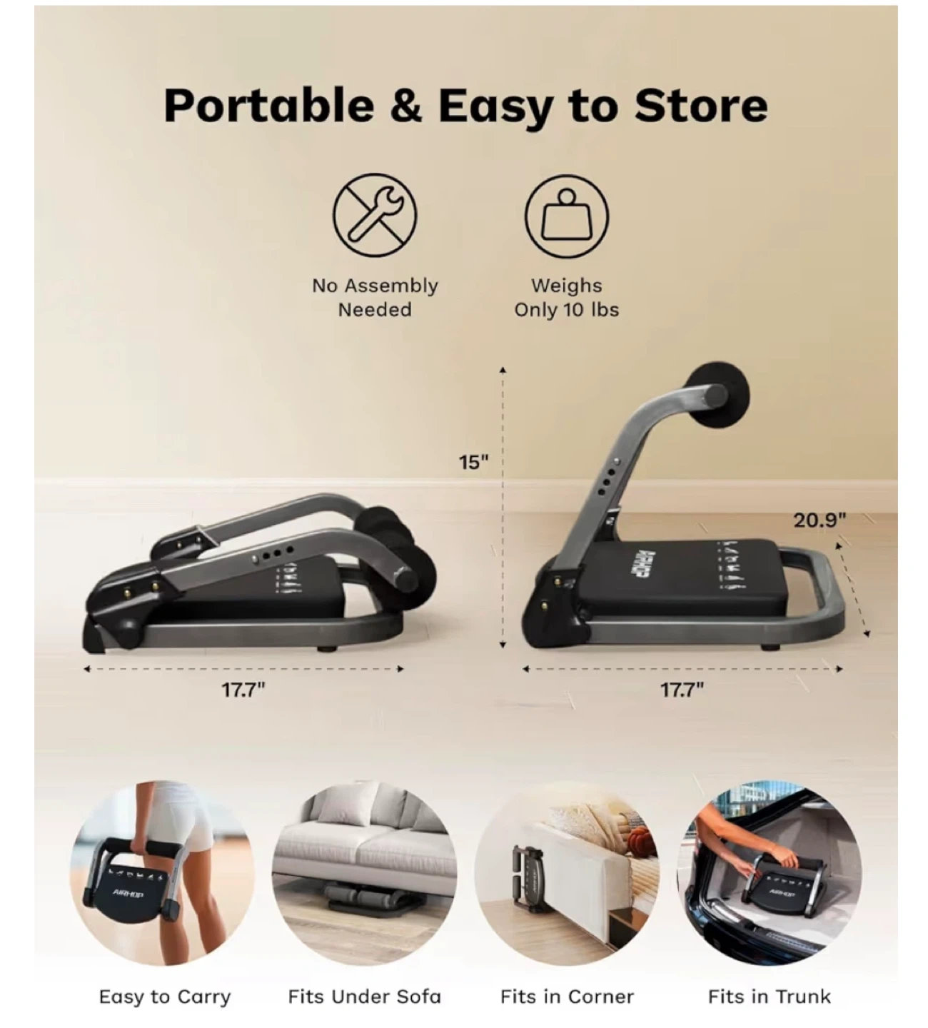 AIRHOP abdominal machine, model AH-AB10. It comes with the original box and instructions. Barely used and in perfect condition. 8-in-1 Full-Body Workout: Maximize your fitness with a versatile ab machine that delivers a comprehensive workout. Perform sit-ups, push-ups, glute bridges, scissor kicks, forearm curls, triceps dips, ab tucks, and bicycle crunches all in one session. Foldable and easy to store.