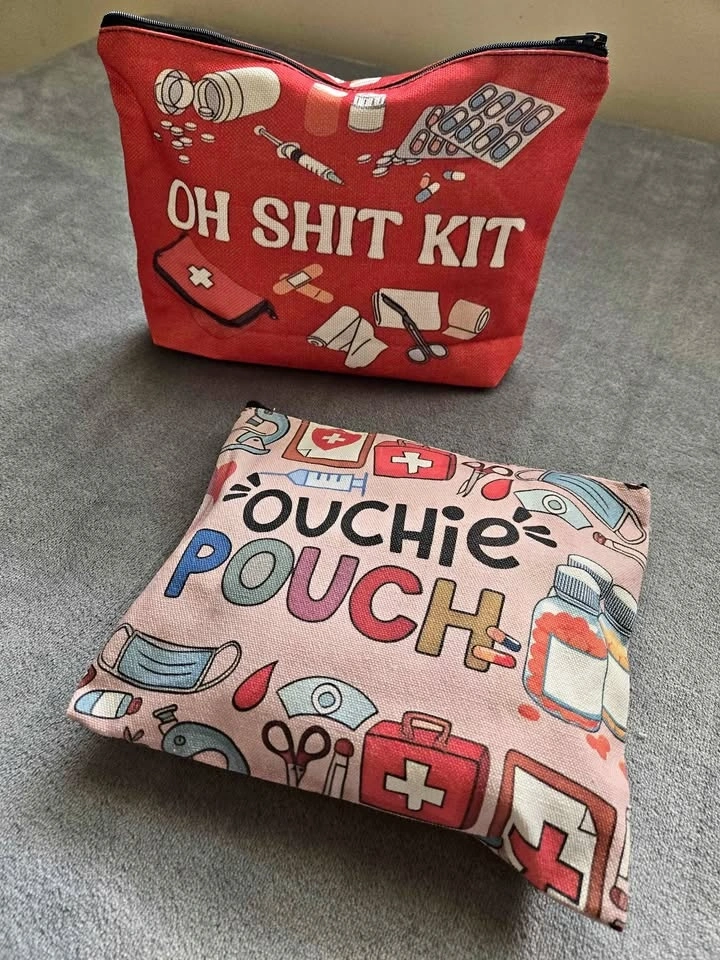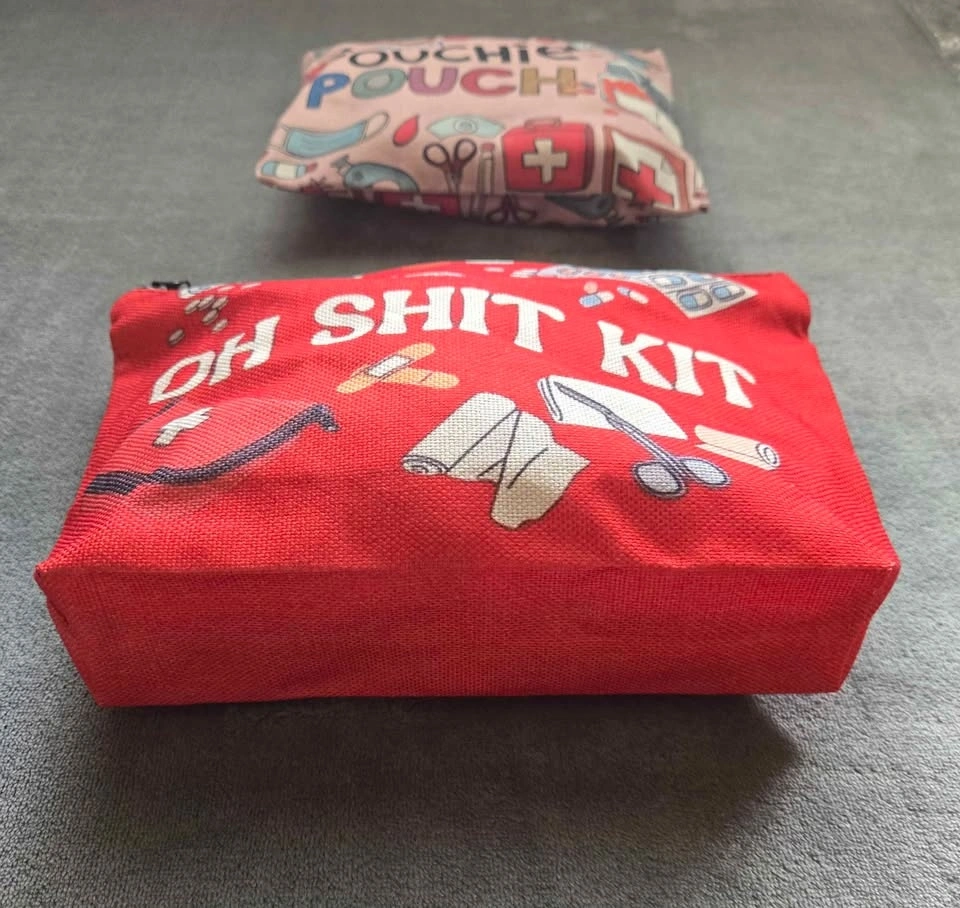 2 Playful Medical-Themed, Portable First-Aid Zip Pouches, with Front + Back Humorous Prints: