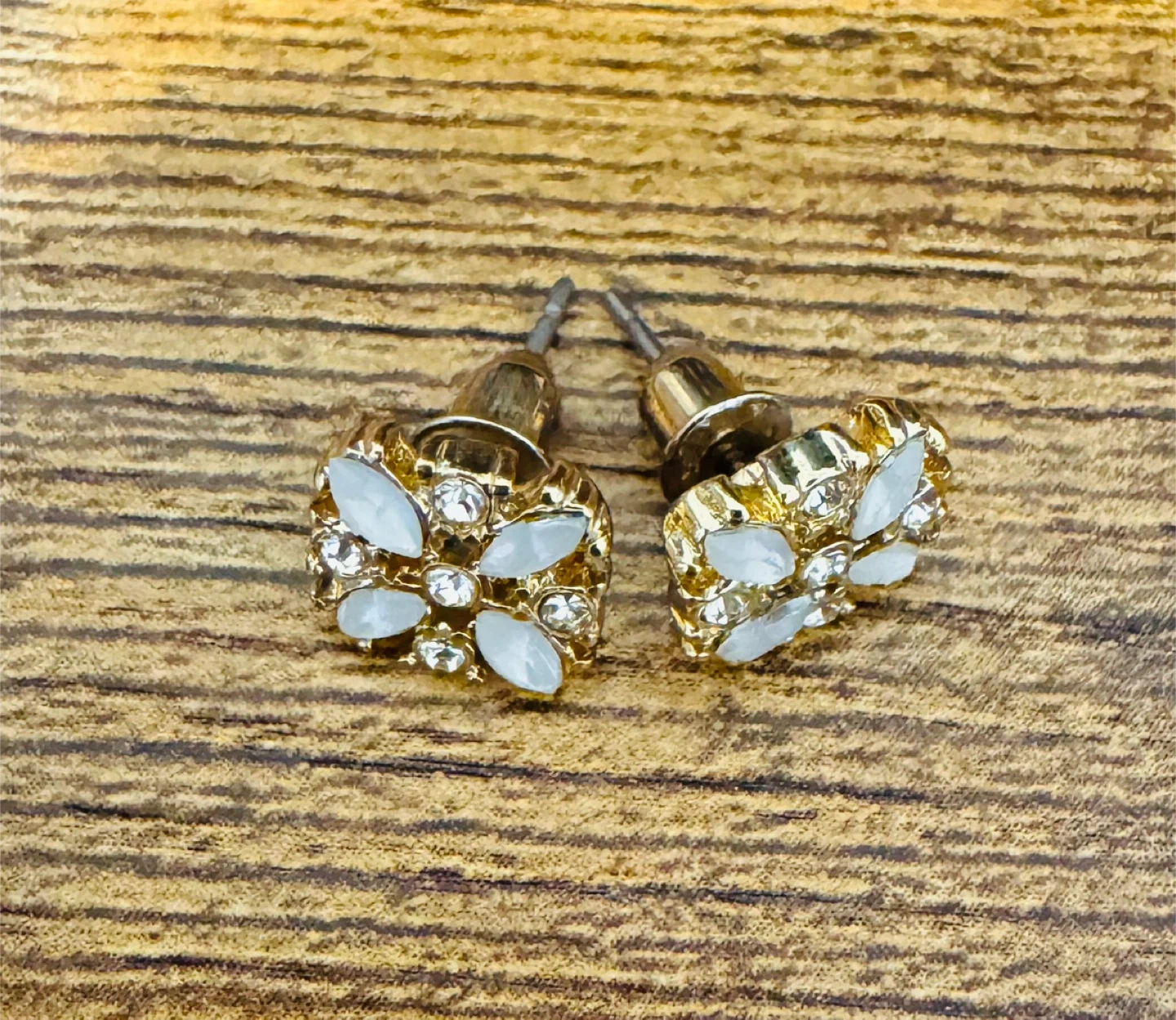 These are a pair of gold-tone stud earrings with a flower design. They feature small white and clear stones. Perfect for adding a touch of sparkle to any outfit!
