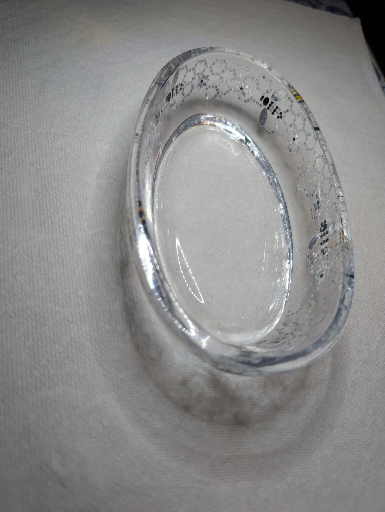 Here's a lovely clear glass bowl with a delicate design. It's in great shape and would be perfect for adding a touch of charm to any room! Made with clear resin and bee's sticker around the rim.