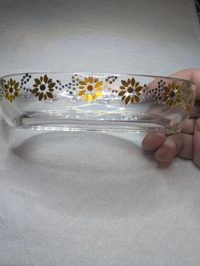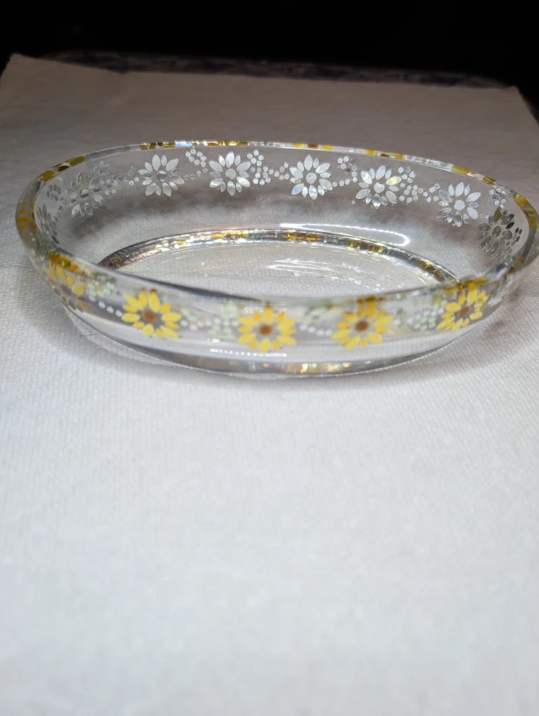 Selling a lovely glass bowl with a floral design around the rim. It's in great shape and would be perfect for serving snacks or as a decorative piece! Made with clear resin and flowers around the rim. Small size