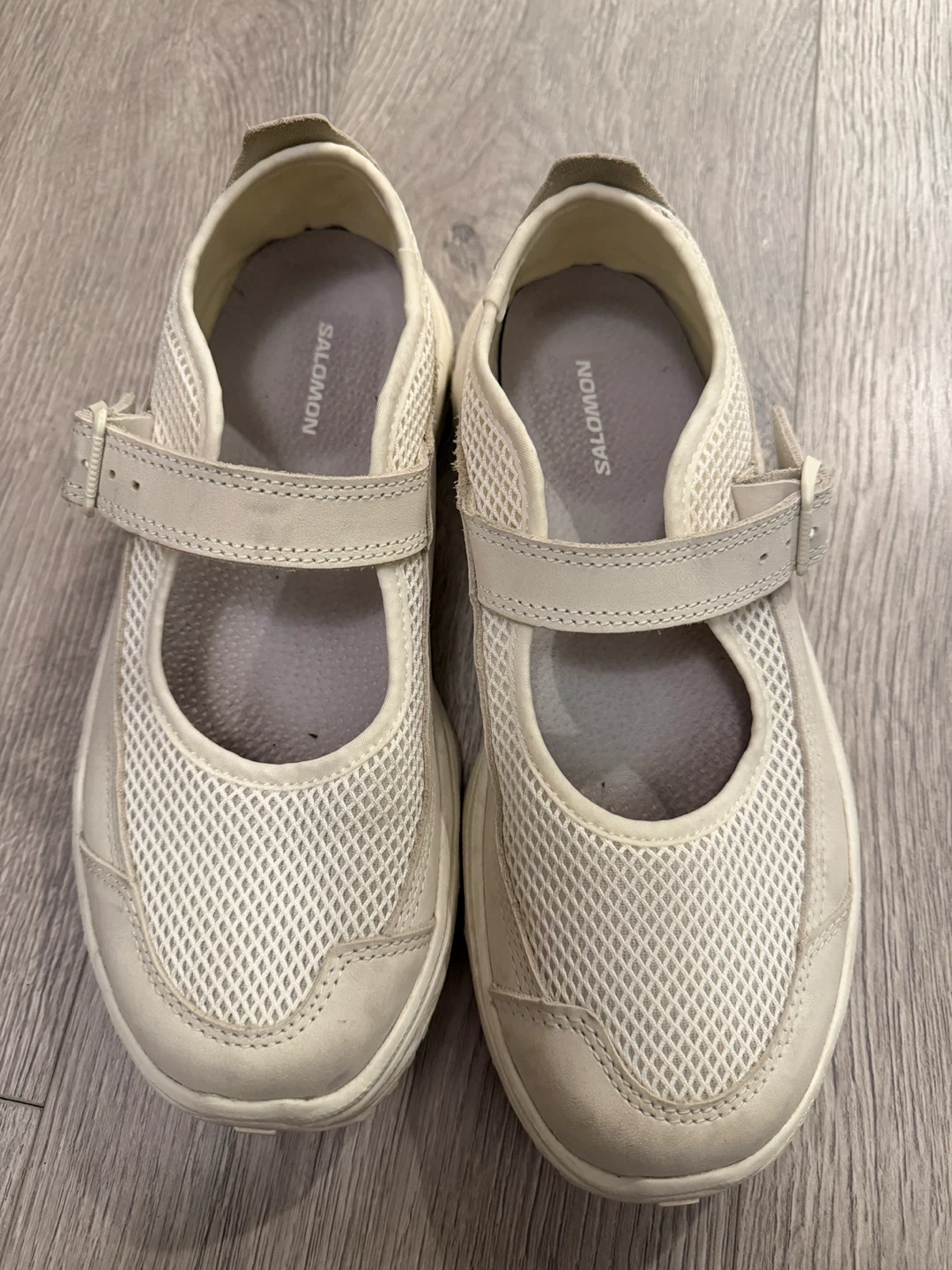 Selling a pair of Salomon Mary Jane style shoes. They are a women's size 8.5 US. They have a velcro strap and a breathable mesh design. Perfect for everyday wear!