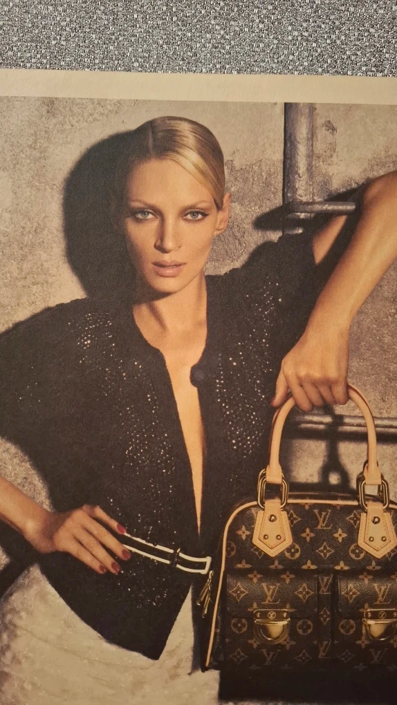 Luxury Louis Vuitton advertisement featuring a premium LV handbag & model actress Uma Thurman