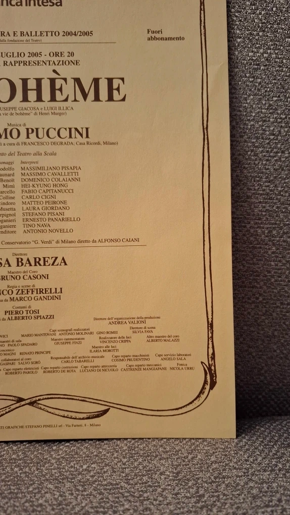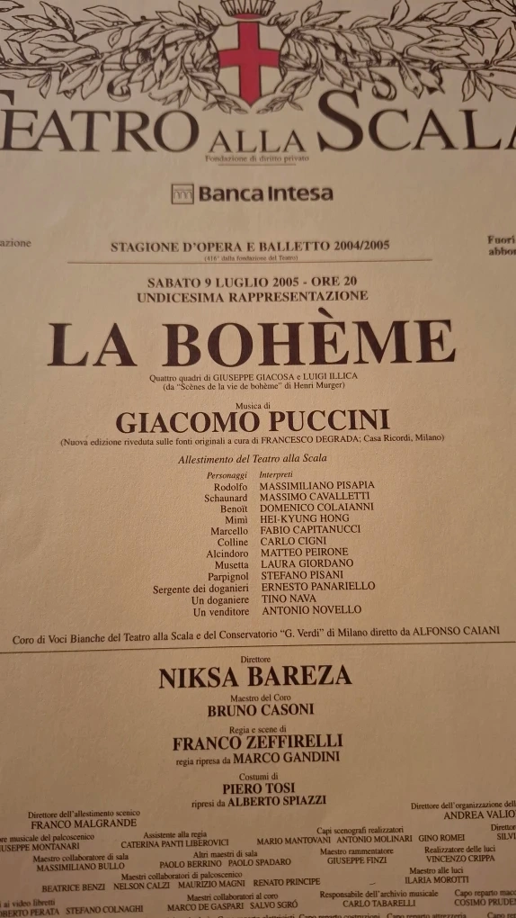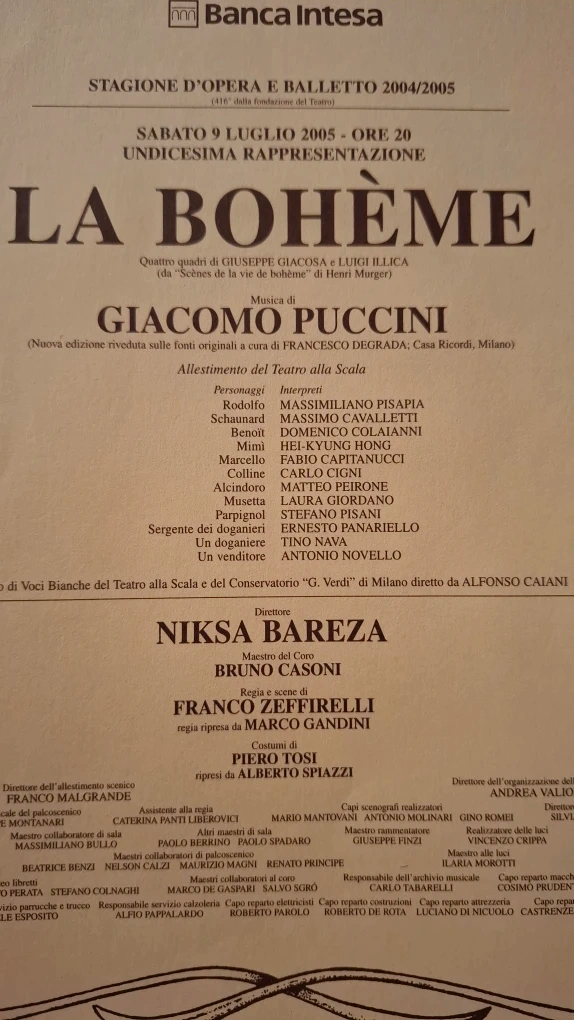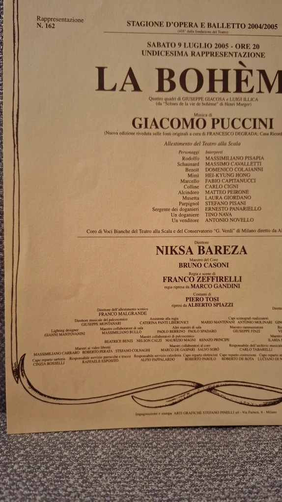 Available for sale is an original program sheet from the July 9, 2005 performance of La Bohème at Teatro alla Scala (Milan, Italy). This is an authentic, printed-at-the-theatre handout/sheet from the 2004–2005 opera season and features full cast listing, production credits, and historic theatre formatting.