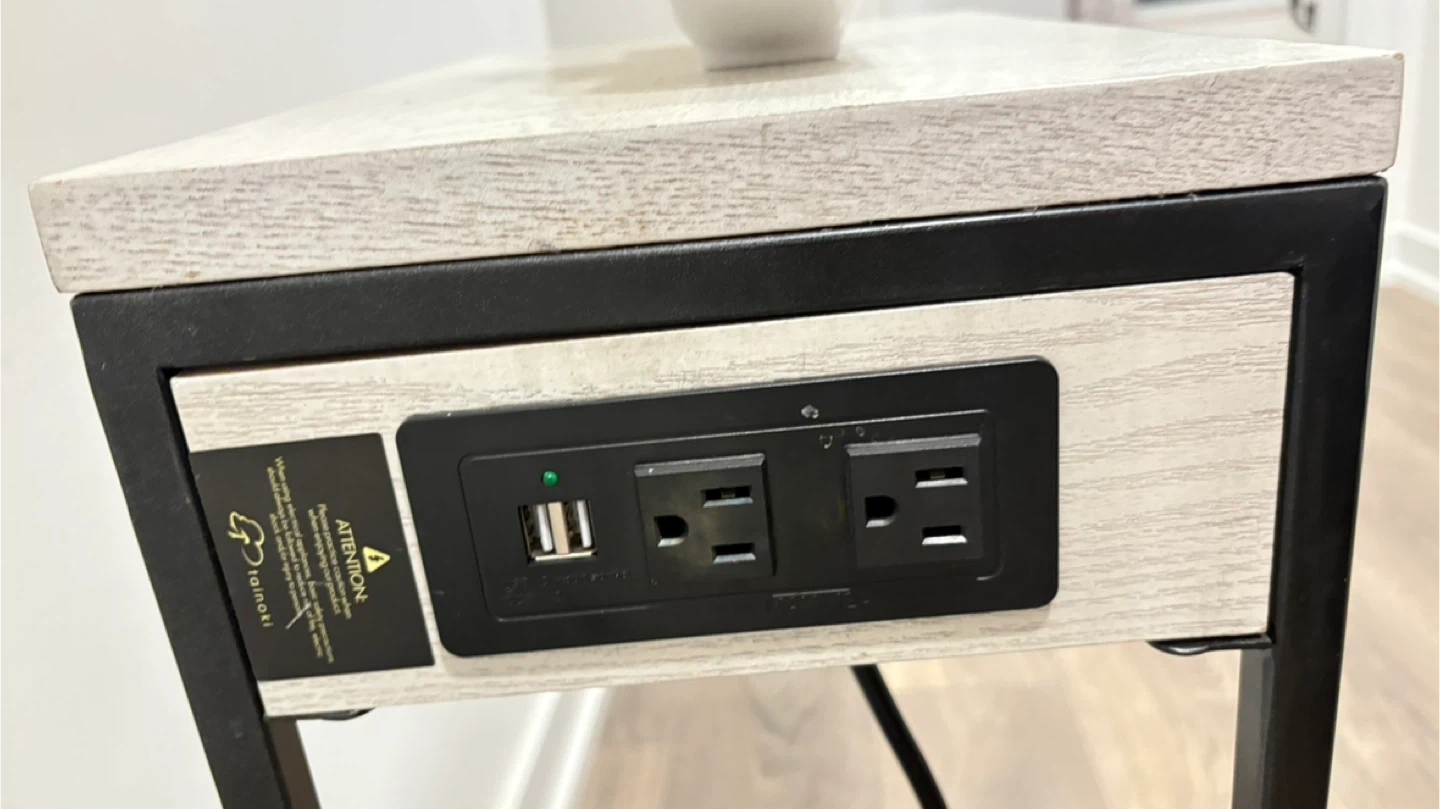 Selling a Plainoxl end table featuring a sleek design with built-in USB ports and power outlets! It's perfect for keeping your devices charged and ready to go. The table has a modern look with a light-coloured top and black metal frame. It's in great condition and ready to add convenience to your living space