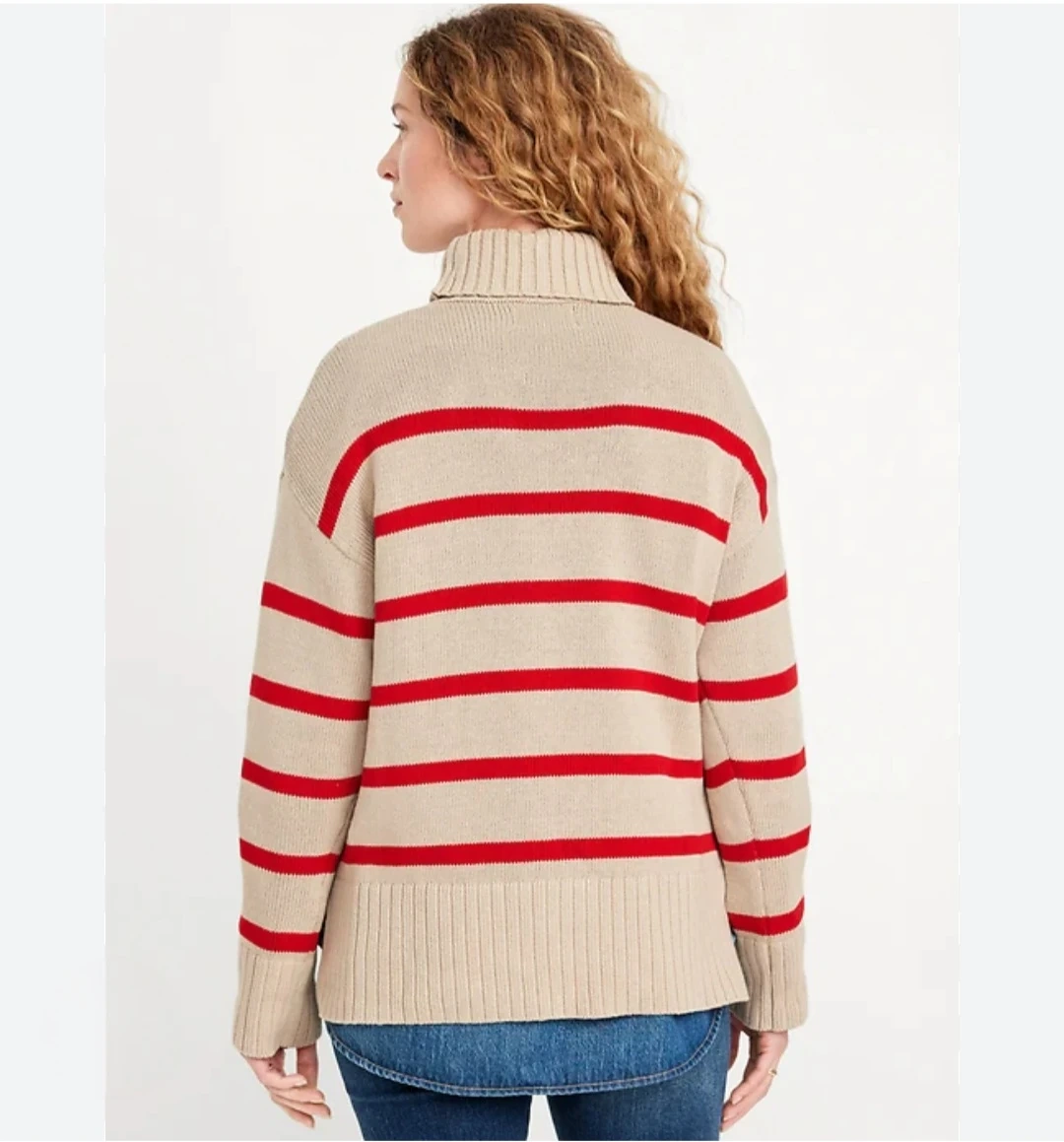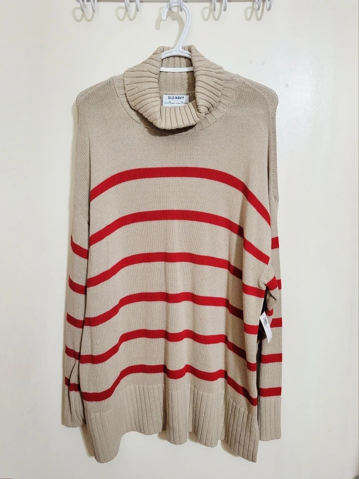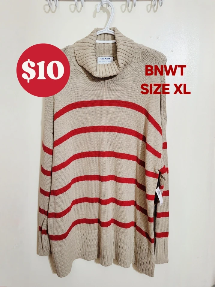 Turtleneck Sweater -From/Brand: Old Navy -BRAND NEW WITH TAGS STILL ON! -NEVER WORN! So it's giftable! 🎁 -Size: XL -Material: 100% Cotton -Colour: Tan & Red -Pattern: Stripes -Tunic length -Very giftable item! 🎁🎄 -Perfect for the season! 📸PLEASE SEE PHOTO GALLERY FOR MORE DETAILS ABOUT THIS ITEM📸 Asking only $10 (FIRM & FINAL) 💰CASH ONLY, PLEASE💰 ⚠️Please only message if you are SERIOUS about buying AND you know when you'd like to pick up.⚠️ 🚙Located in North Oshawa BEATRICE & RITSON area.🚙 ⏰️No holds longer than 2 days.⏰️ ❗️CROSS POSTED❗️