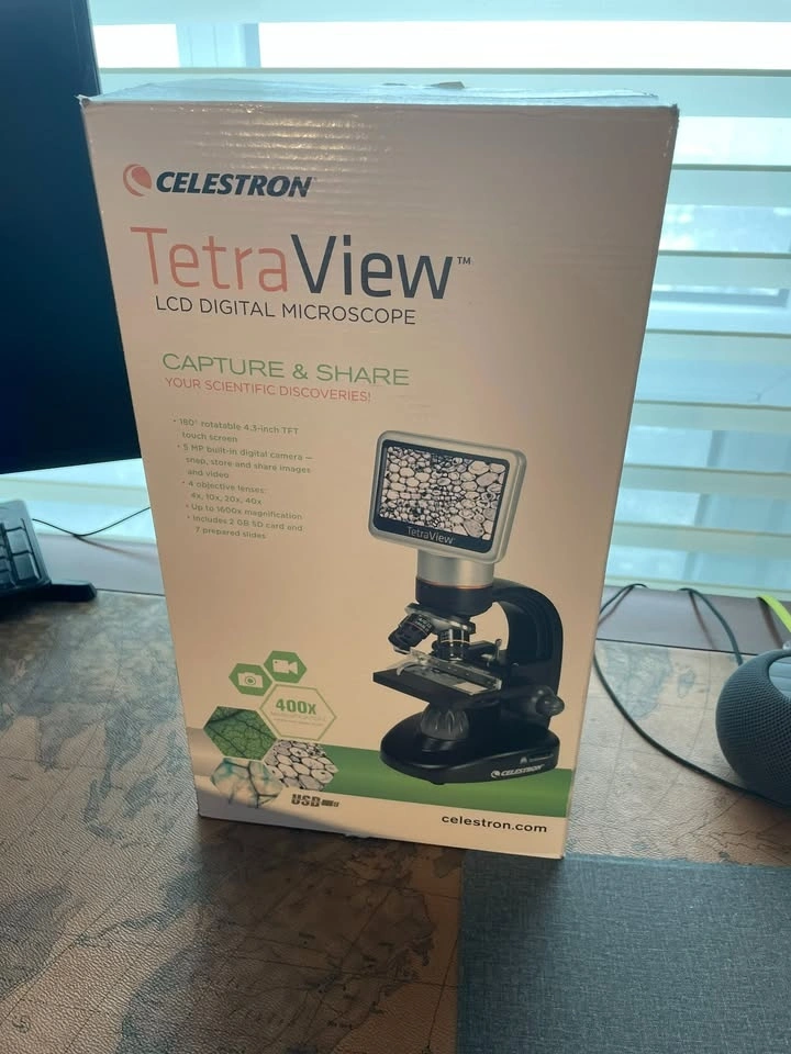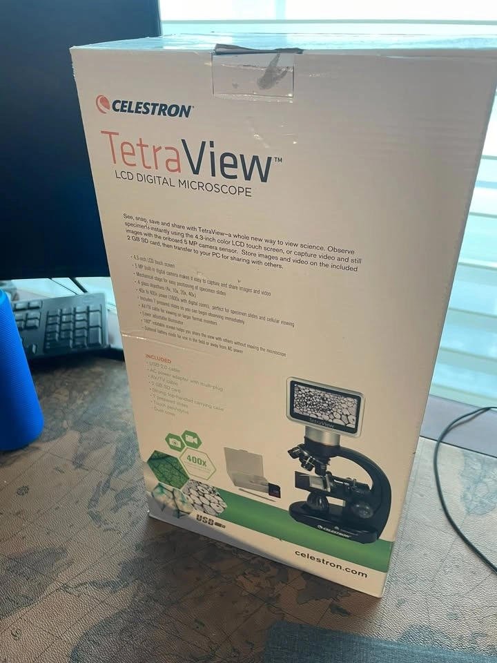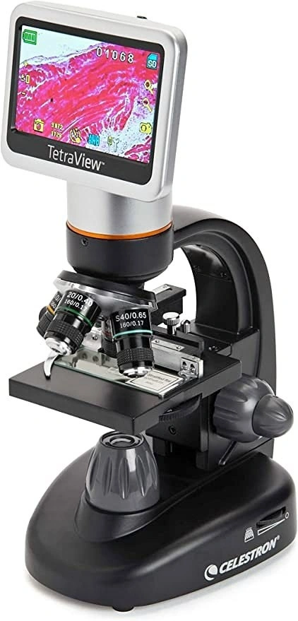 Accessories included: 7 prepared slides, hard carrying case, dust cover, touch pen, USB cable, AV out cable