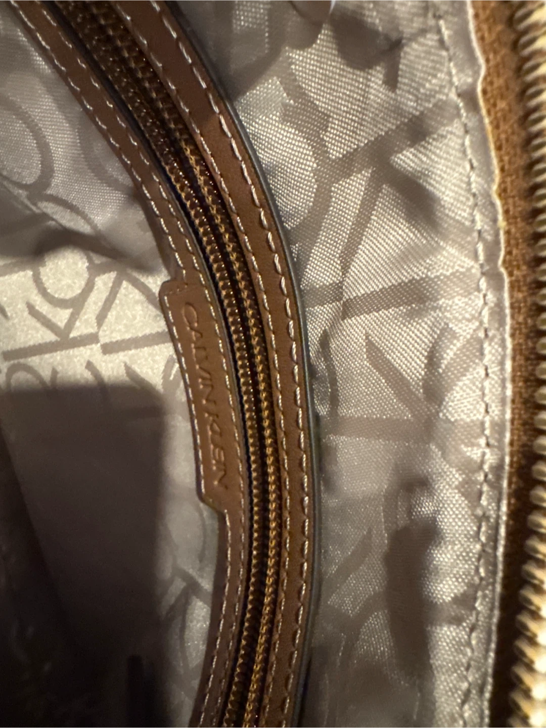 Selling a Calvin Klein crossbody bag! It's in great condition and perfect for everyday use. The bag features a stylish design with the CK logo pattern and a brown leather-like base. It's a convenient size for carrying your essentials while keeping your hands free