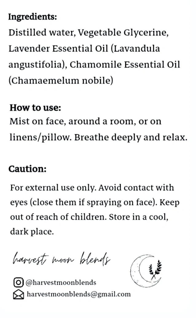 List of ingredients: Distilled water, vegetable glycerin, lavender essential oil (Lavandula angustifolia), roman chamomile essential oil (Chamaemelum Nobile).