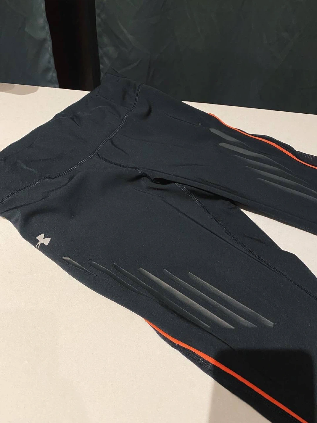 Under Armour women's 7/8 length running leggings. Black with orange accents. Features a built-in speed pocket. Great for workouts.