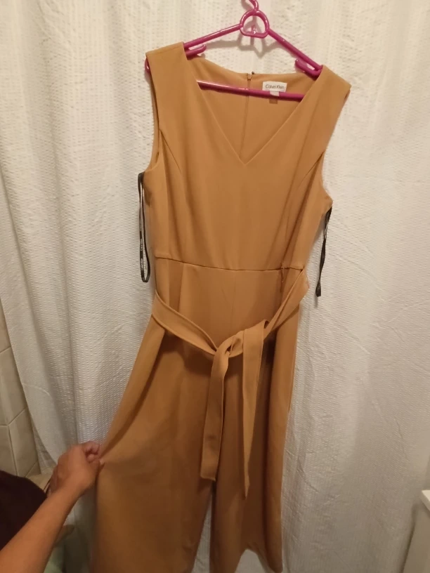 Selling a Calvin Klein jumpsuit in a beautiful tan color! It's a size medium and features a flattering V-neck design and a tie waist. Perfect for dressing up or down!
