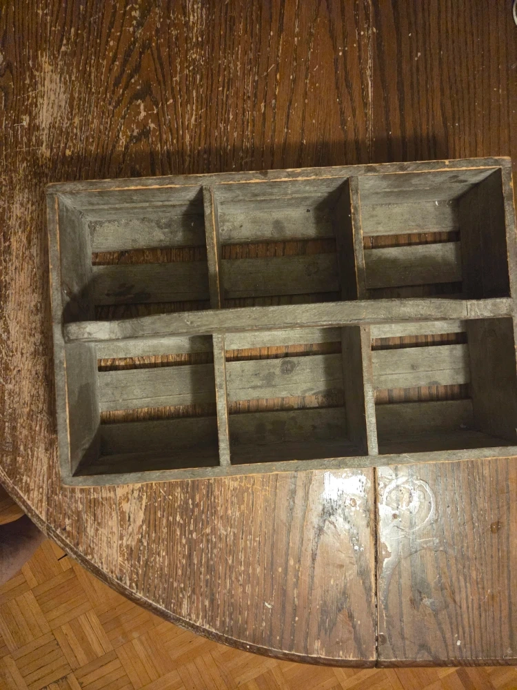 Selling a rustic wooden tool box with a handle. It has 6 compartments for storage. Perfect for organizing tools or as a decorative piece!