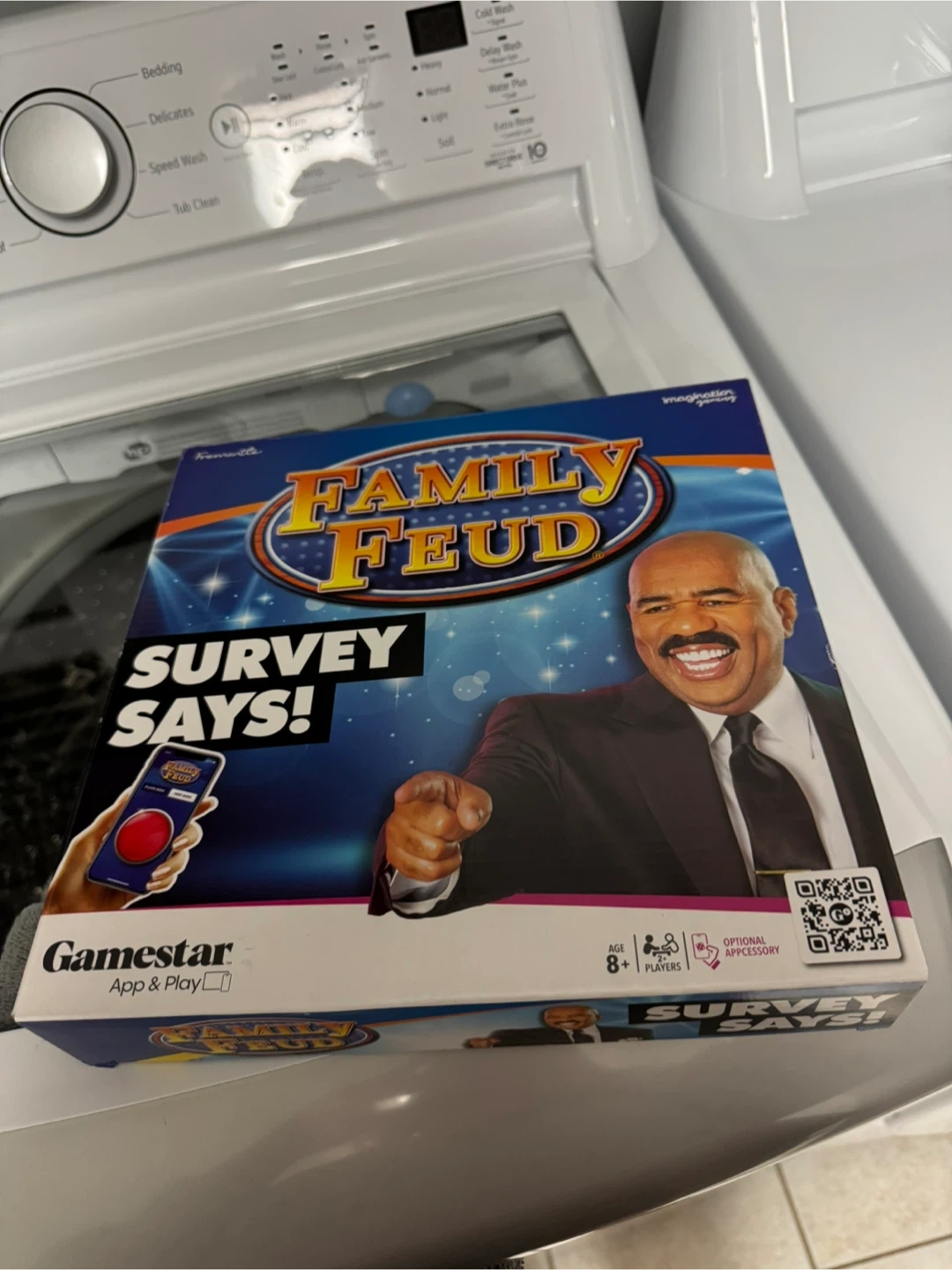 Selling a Family Feud: Survey Says! board game. It's complete with scoreboards, face off cards, fast money cards, and survey question cards. Great for game nights with family and friends!