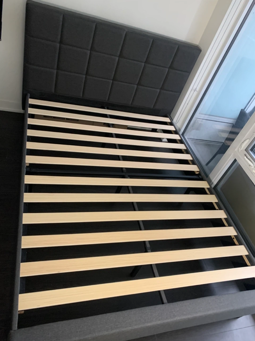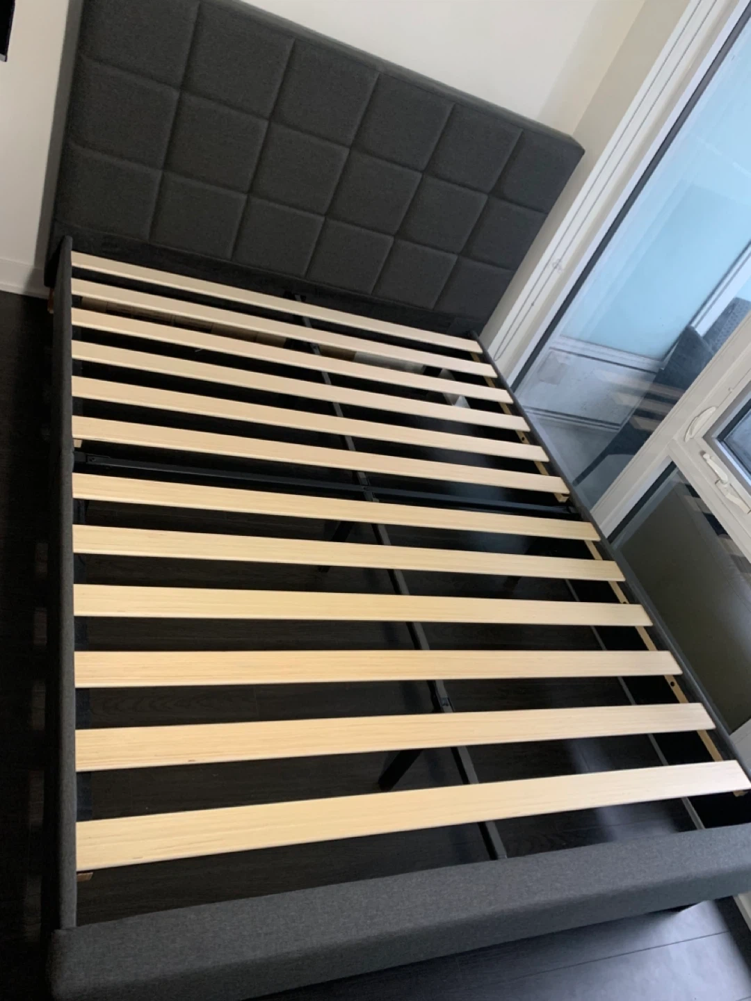 Selling a queen size bed frame in dark grey. It's in great condition and ready for a new home. The frame includes the headboard and wooden slats for support. Perfect for a modern bedroom!