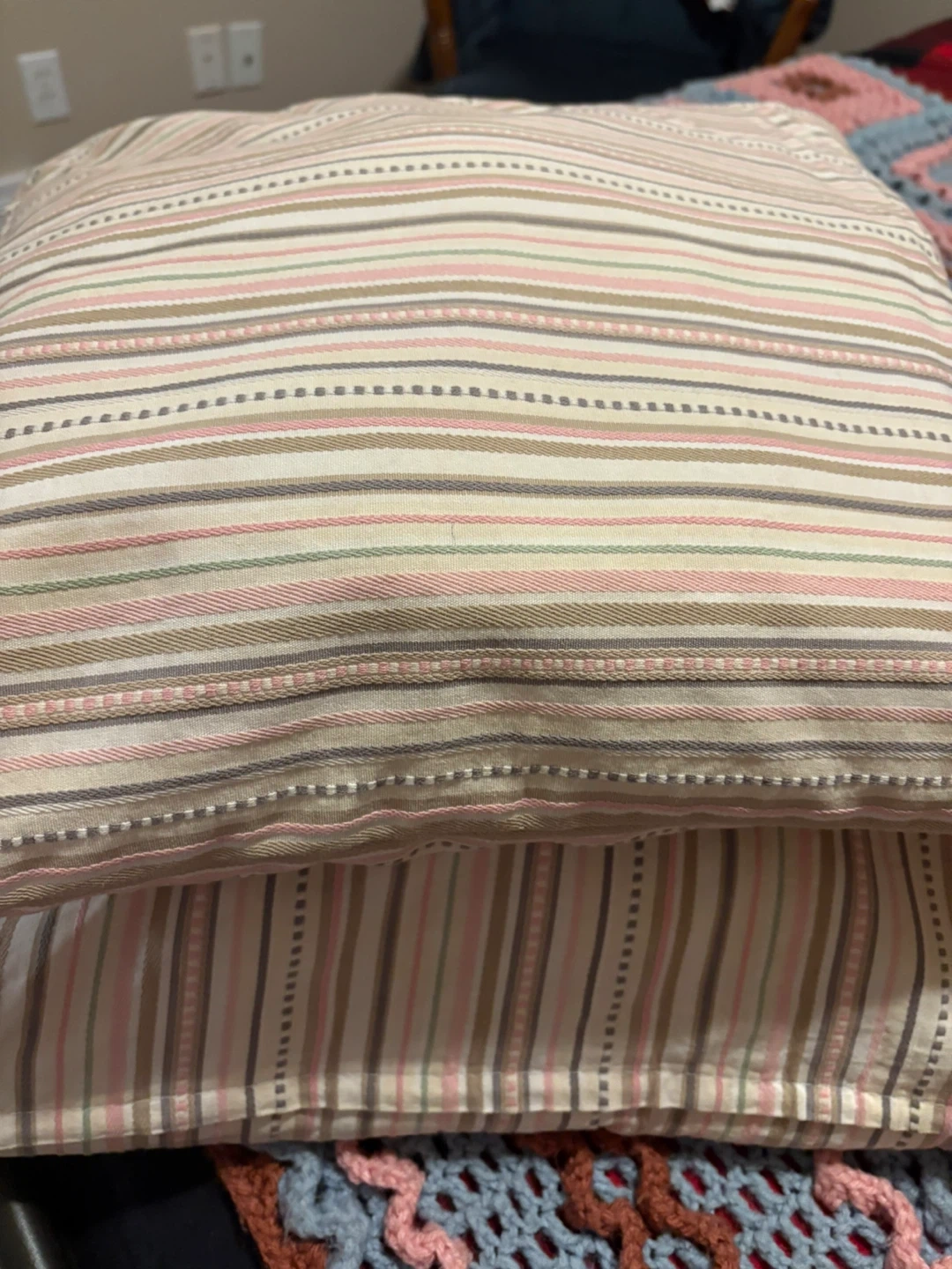 Selling a handmade crocheted blanket with matching pillows. The blanket features a unique design with blue, pink, and brown colours. Perfect for adding a cozy touch to your home!