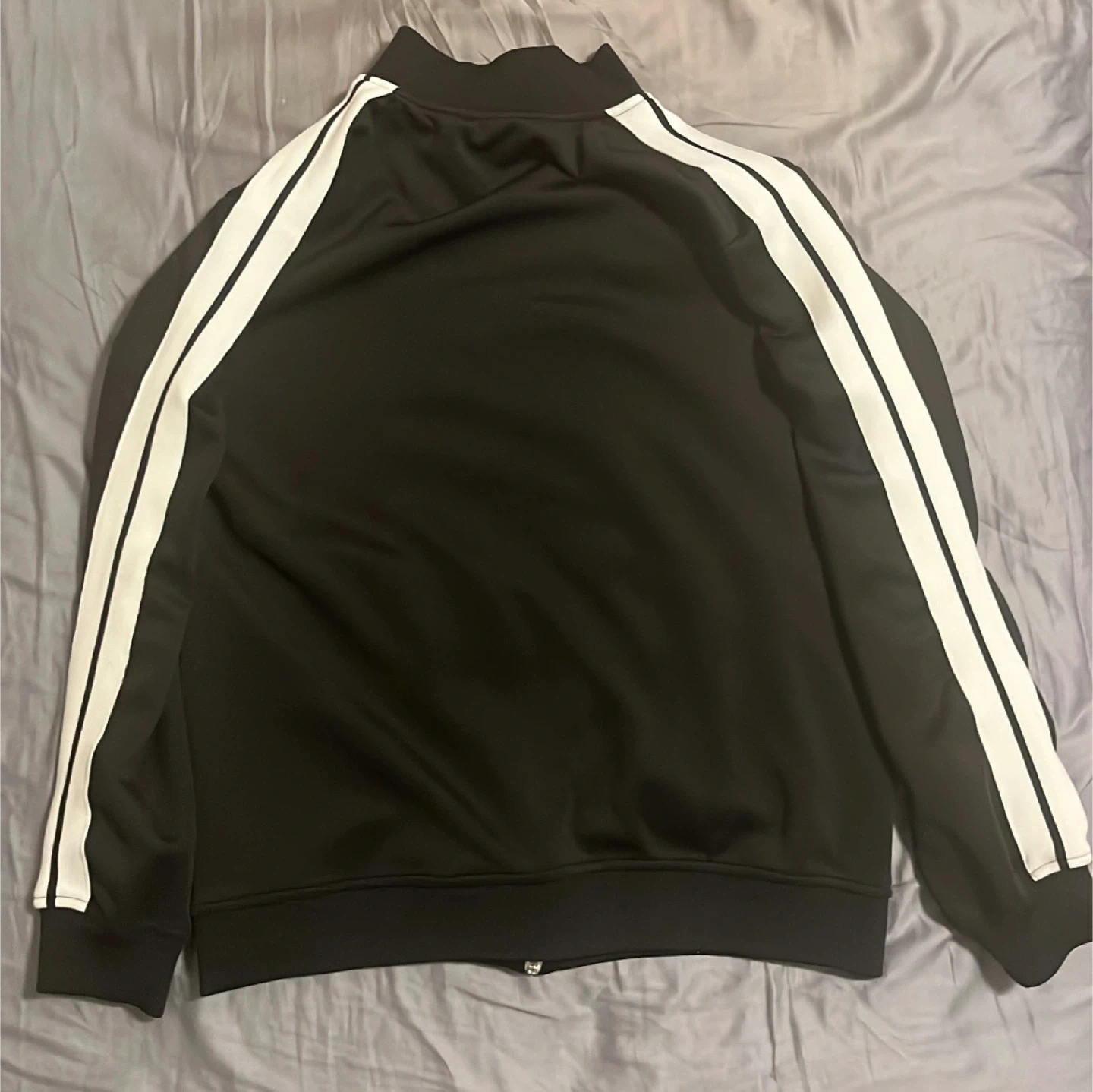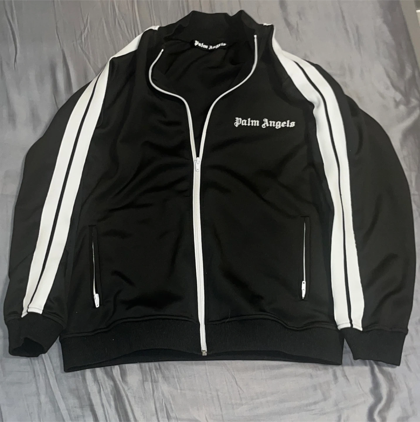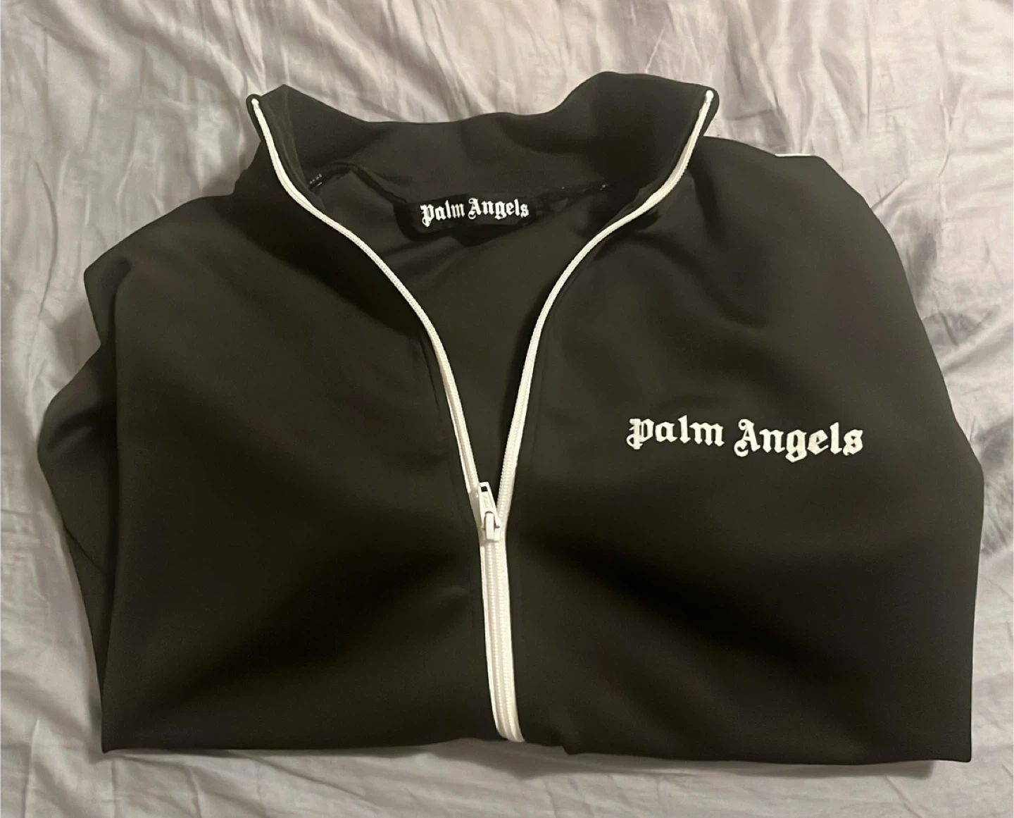 Selling a Palm Angels track full-zip in black. It features the Palm Angels logo on the front and white stripes down the sleeves. It's in great condition with only 3 wears DM for more photos.