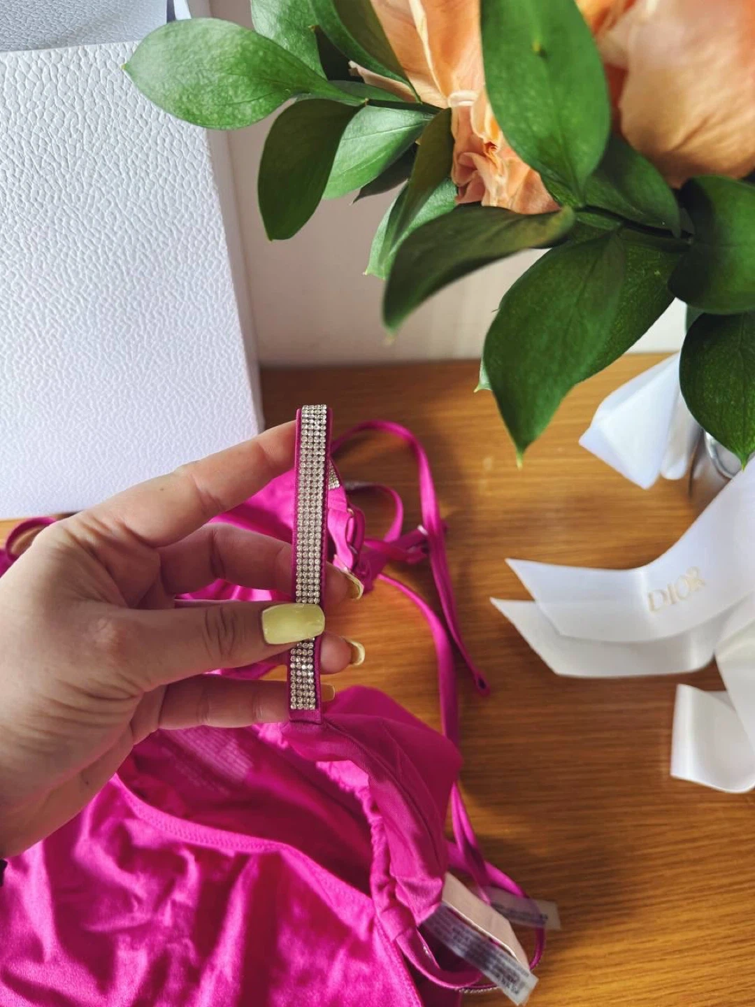 Gorgeous pink bikini. Features rhinestones. Two-piece set. Triangle top and high-cut bottoms. Shiny fabric.