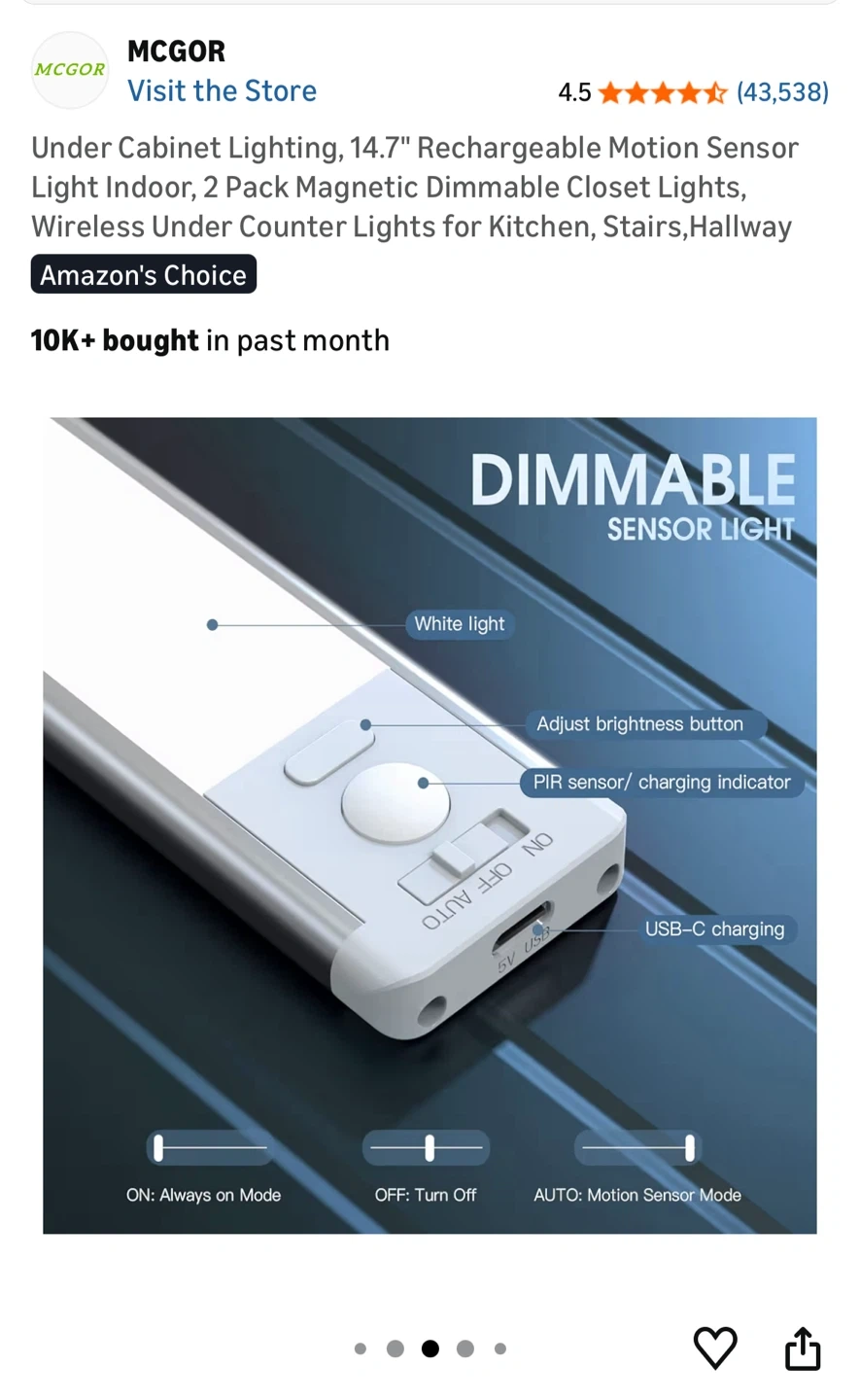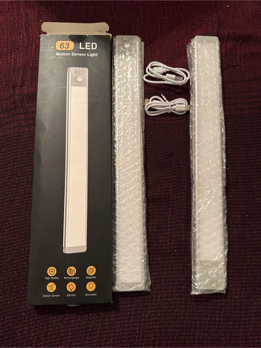 Selling a new 2-pack of MCGOR under cabinet LED lights! These are 14.7" rechargeable motion sensor lights, perfect for indoor use in your kitchen, stairs, hallway, or closet. They have a magnetic design for easy installation and are wireless and dimmable. The box includes the lights and charging cables