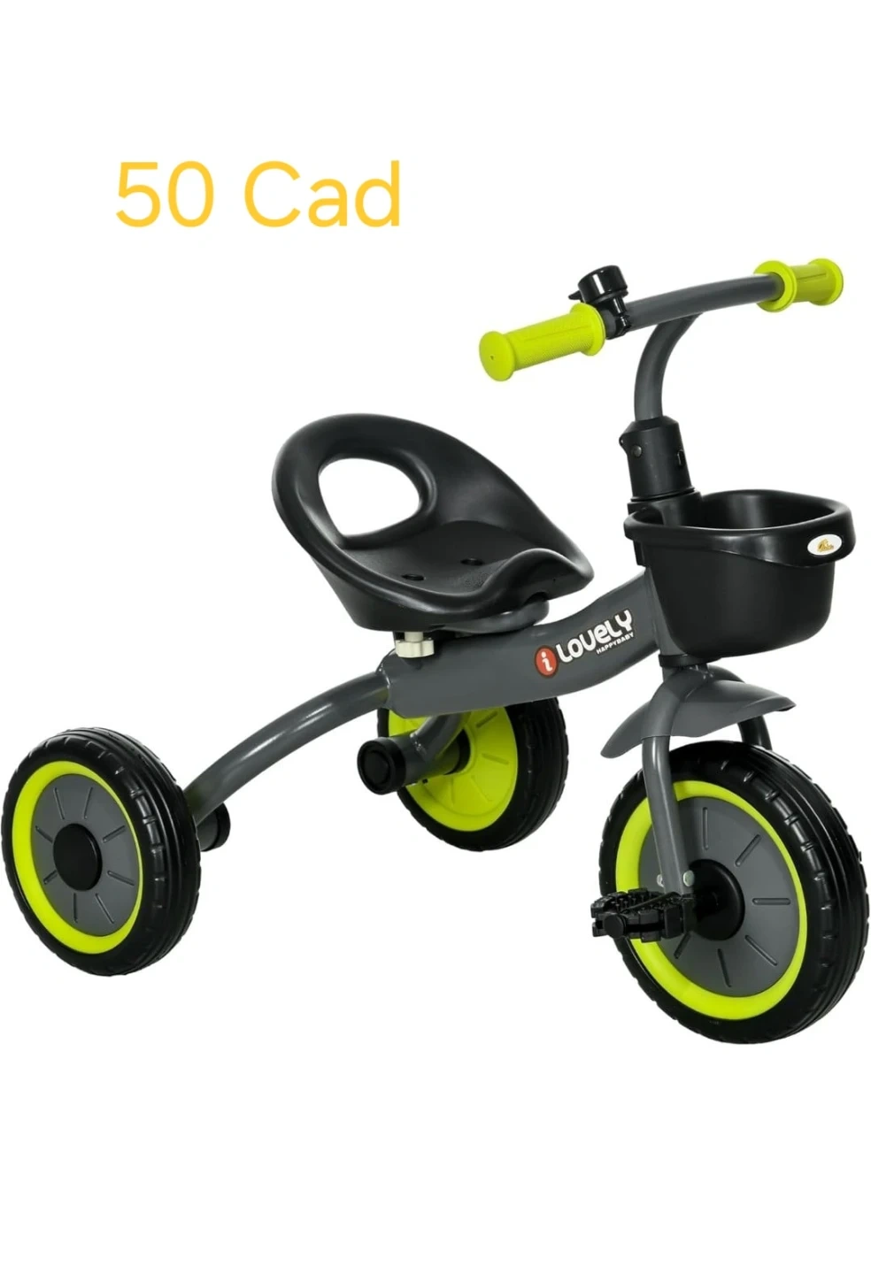 Here's a cute tricycle for your little one! It's in great condition and ready for new adventures. The colours are grey, black and a vibrant lime green. It has a little basket in the front for carrying toys or snacks.