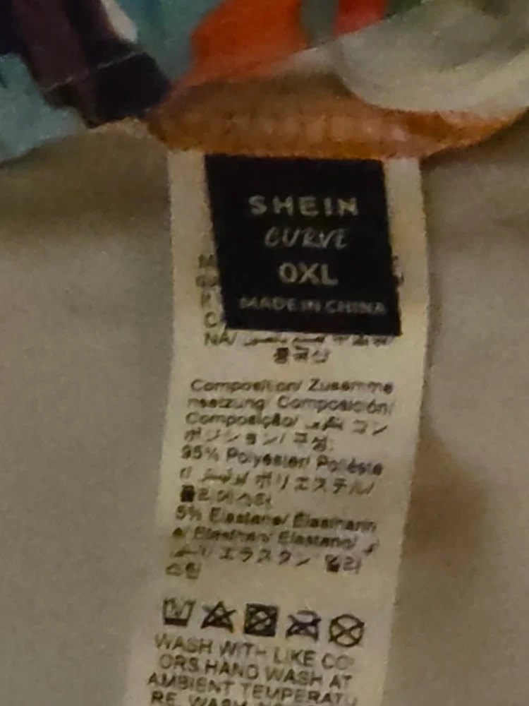 This is a Shein Curve dress in size 0XL. It's made of 95% polyester and 5% elastane. It features a colourful abstract print. Perfect for a casual day out
