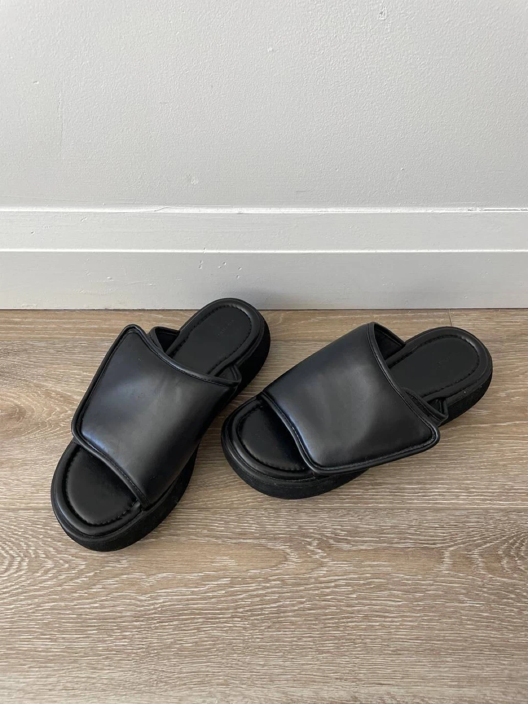 Black leather platform slides. Size 9. Features a unique padded strap design. Comfortable and stylish.
