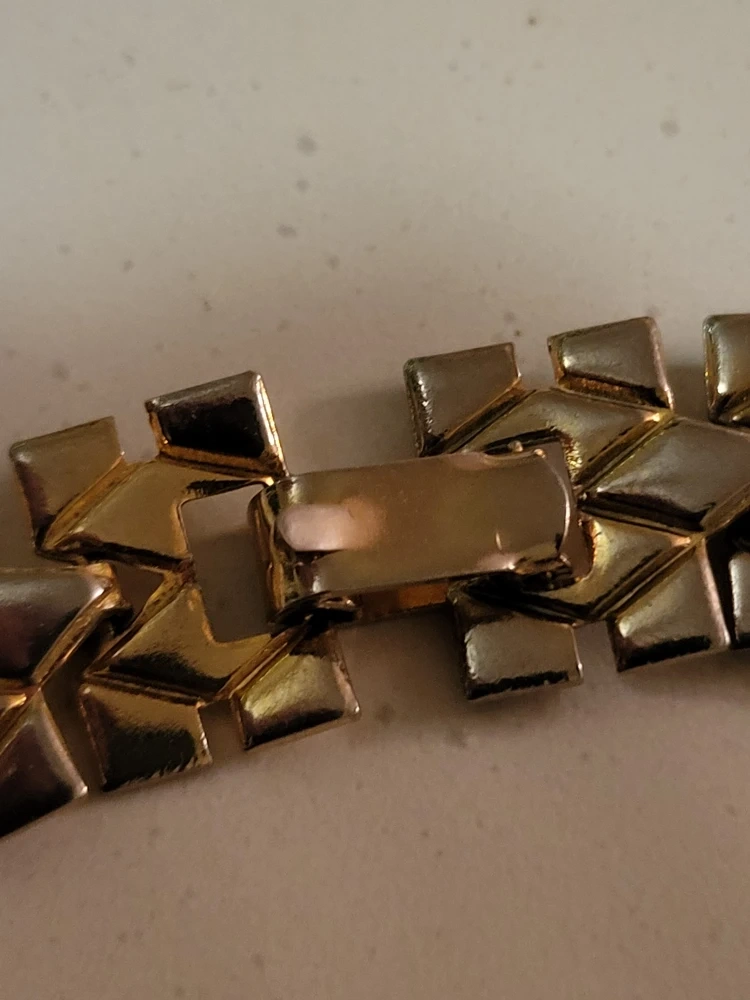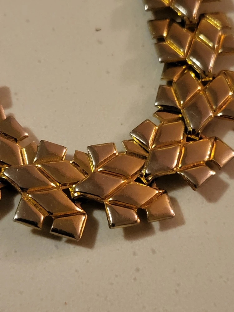 Selling a vintage gold tone necklace. It has a unique design with diamond-shaped links. It's in good condition and ready to add a touch of retro style to your wardrobe!